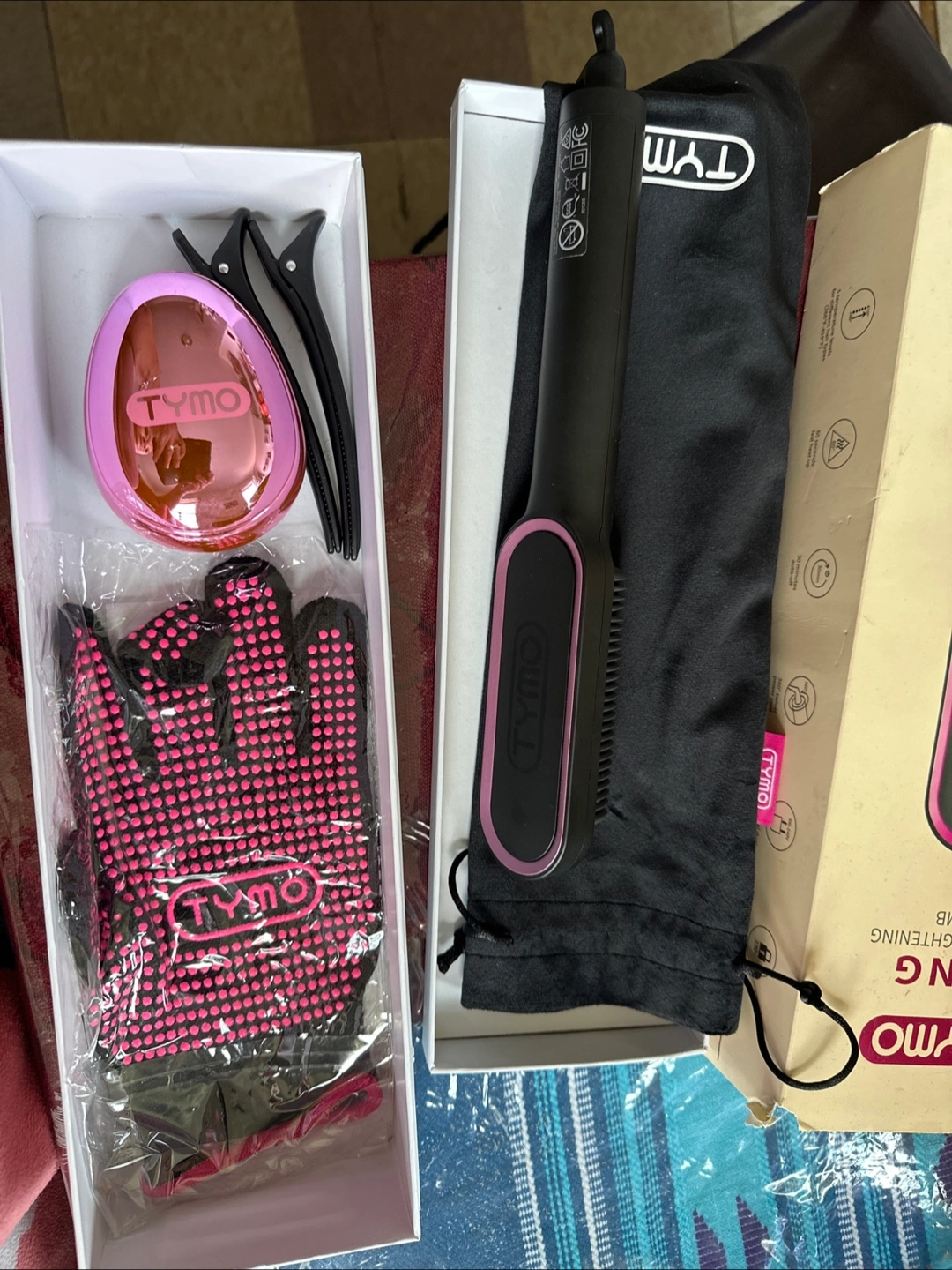 Selling a TYMO hair straightening comb. It comes with all the accessories in the original box, including a heat-resistant glove, hair clips, and a carrying pouch. Great for quick and easy hair styling!