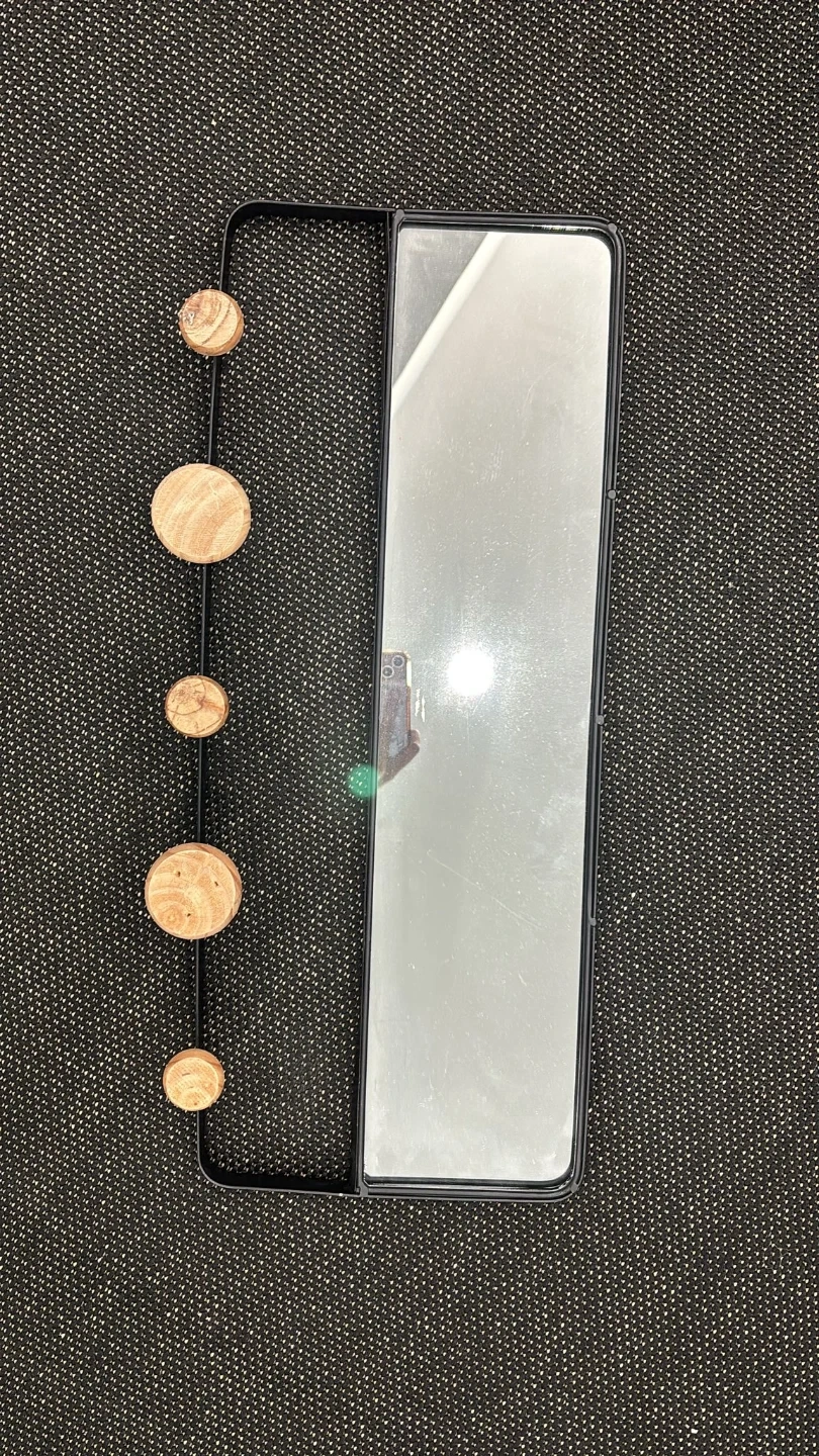 This wall mirror features a sleek black frame with decorative wooden spheres. It's perfect for adding a touch of natural elegance to any room. The frame is metal and the decorative elements are wood.