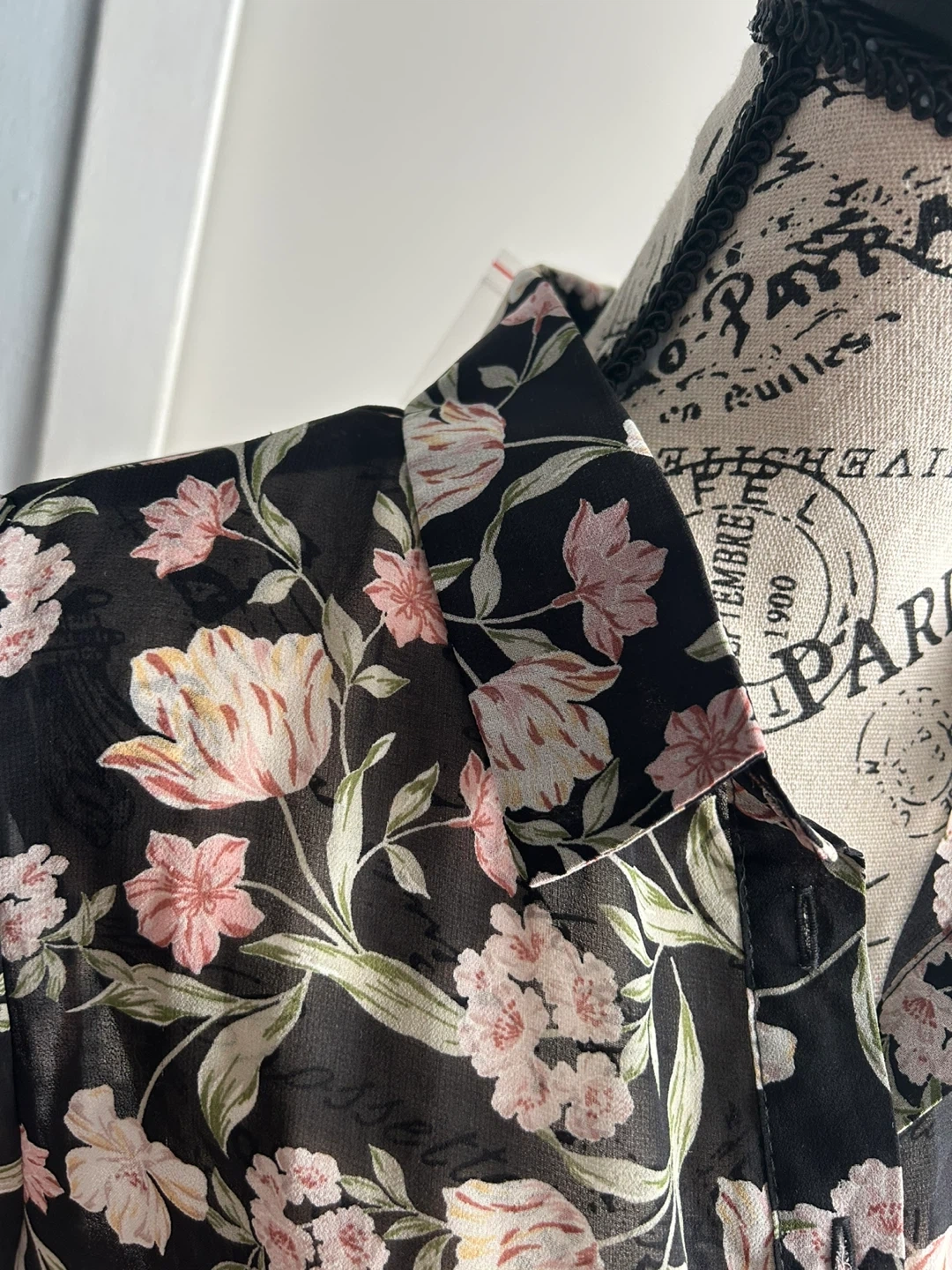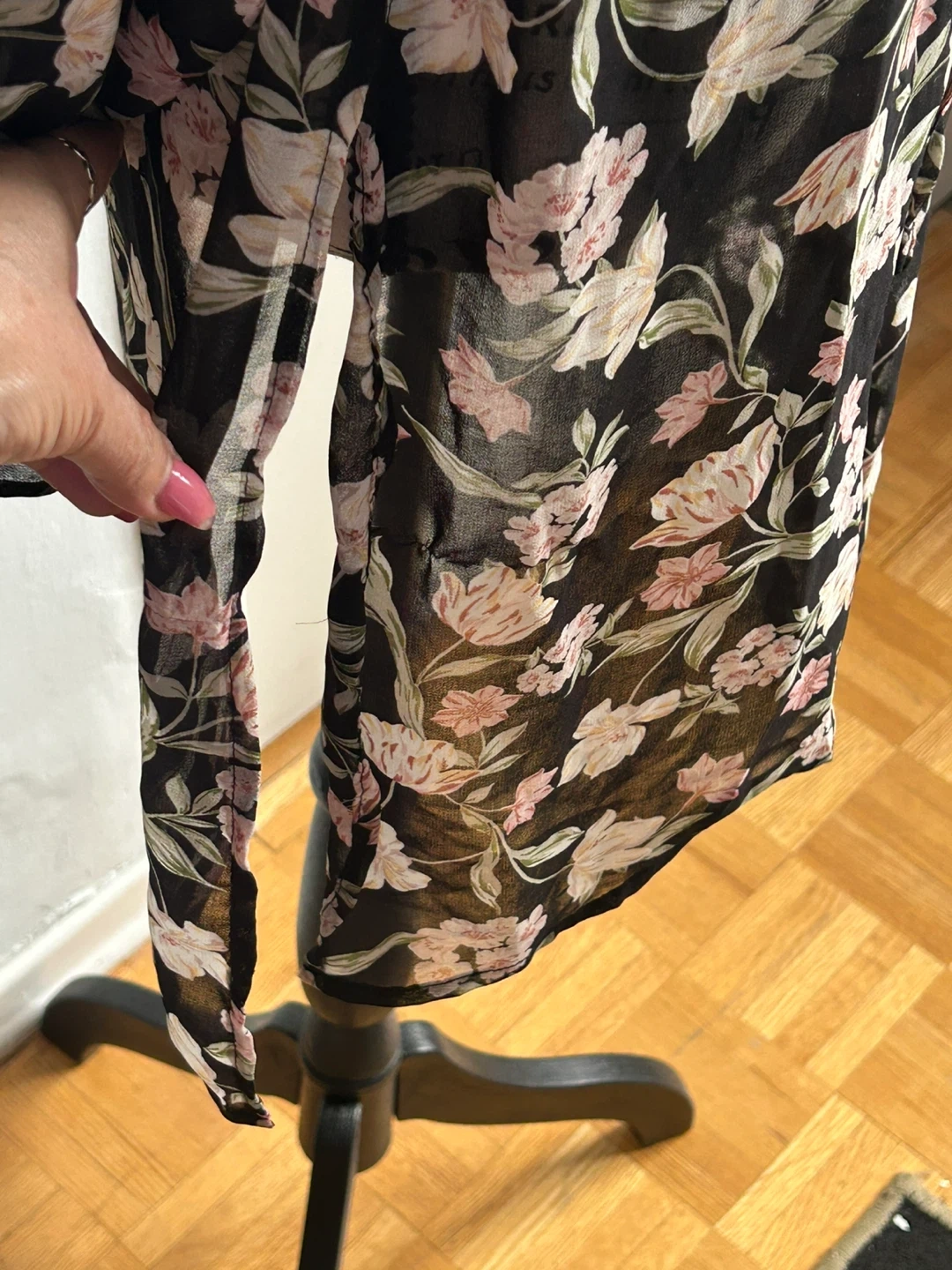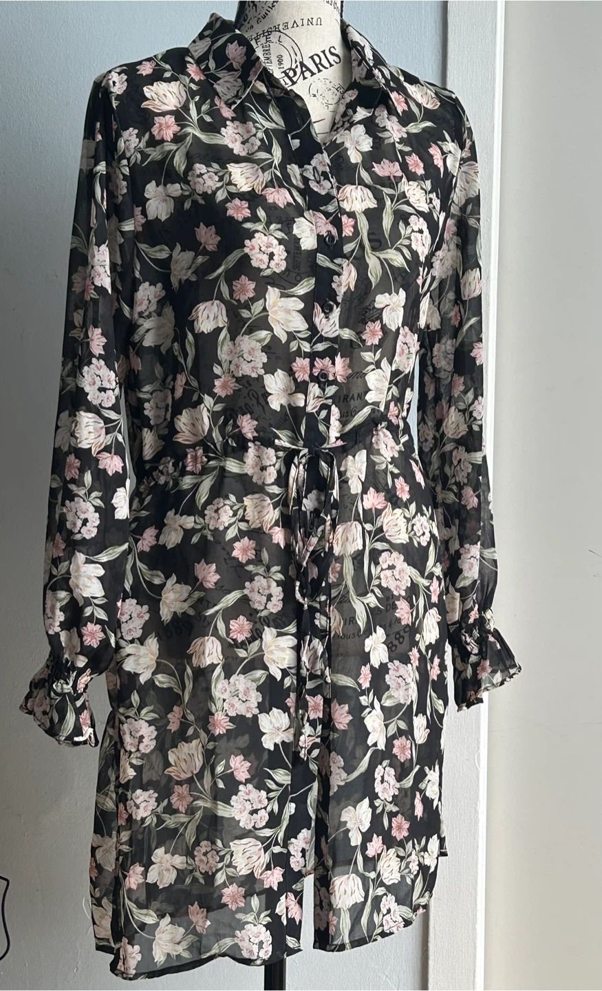 Brand new. This black sheer dress has a beautiful floral print with pink and cream flowers. It features a collared neckline, button-up front, and a tie waist for an adjustable fit. The long sleeves have ruffled cuffs. Size S