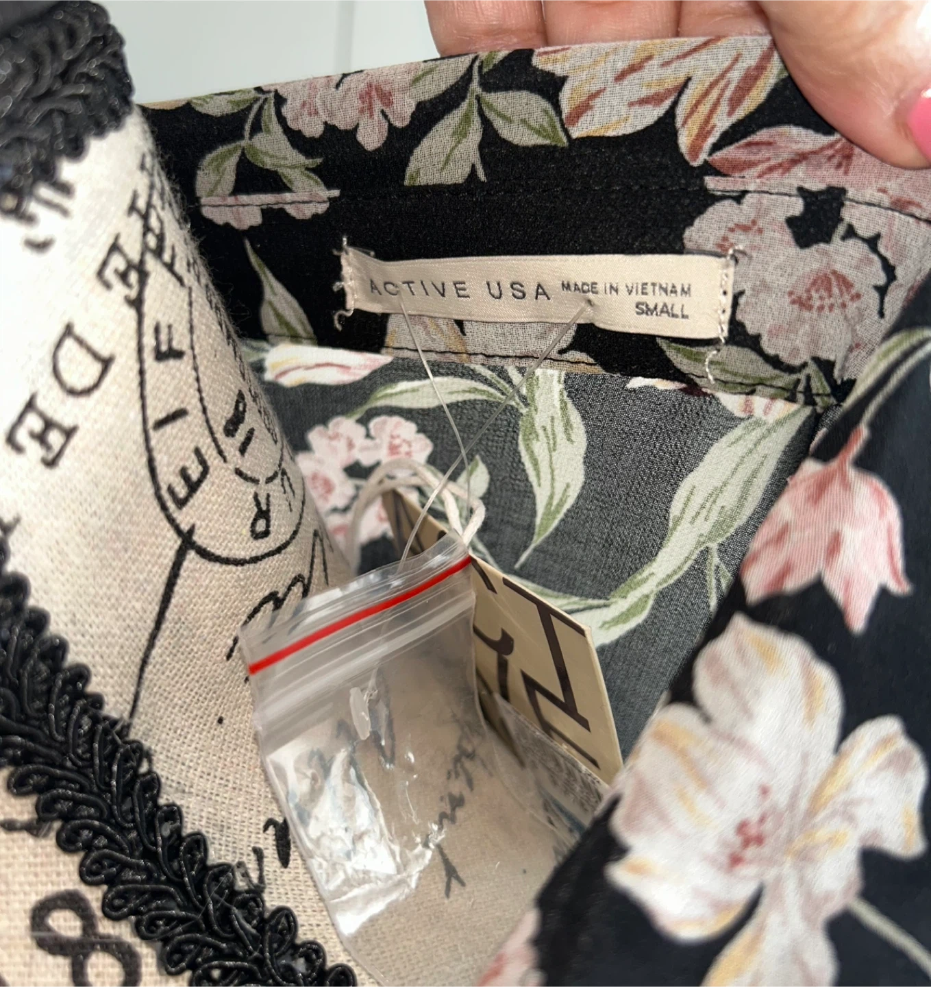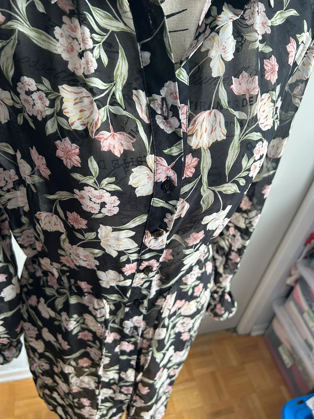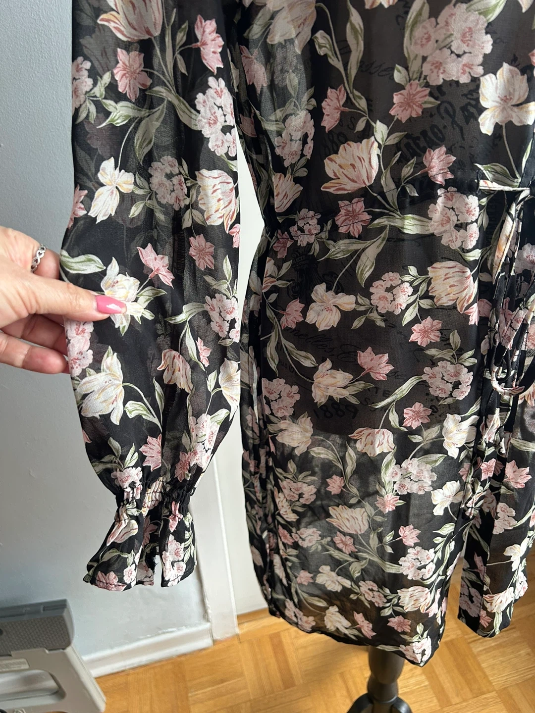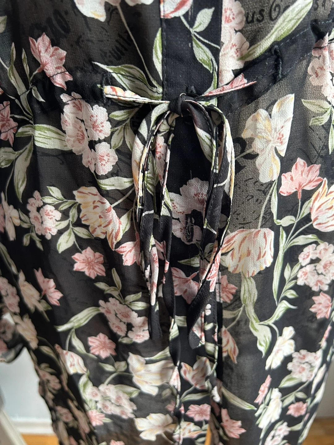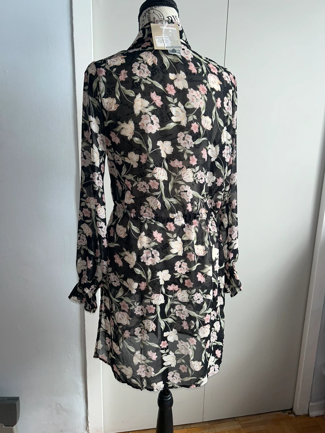 Brand new. This black sheer dress has a beautiful floral print with pink and cream flowers. It features a collared neckline, button-up front, and a tie waist for an adjustable fit. The long sleeves have ruffled cuffs. Size S