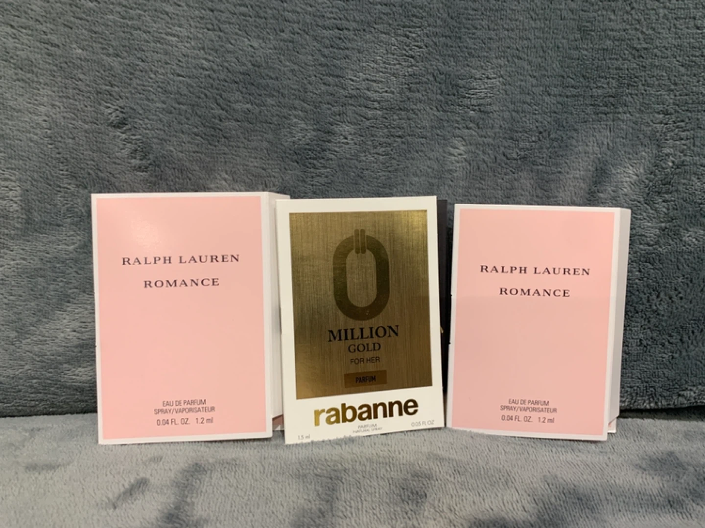 I have two Ralph Lauren Romance and one Rabanne Million Gold perfume samples. Each sample contains 0.04 fl oz (1.2 ml) of eau de parfum. Perfect for trying out these scents!