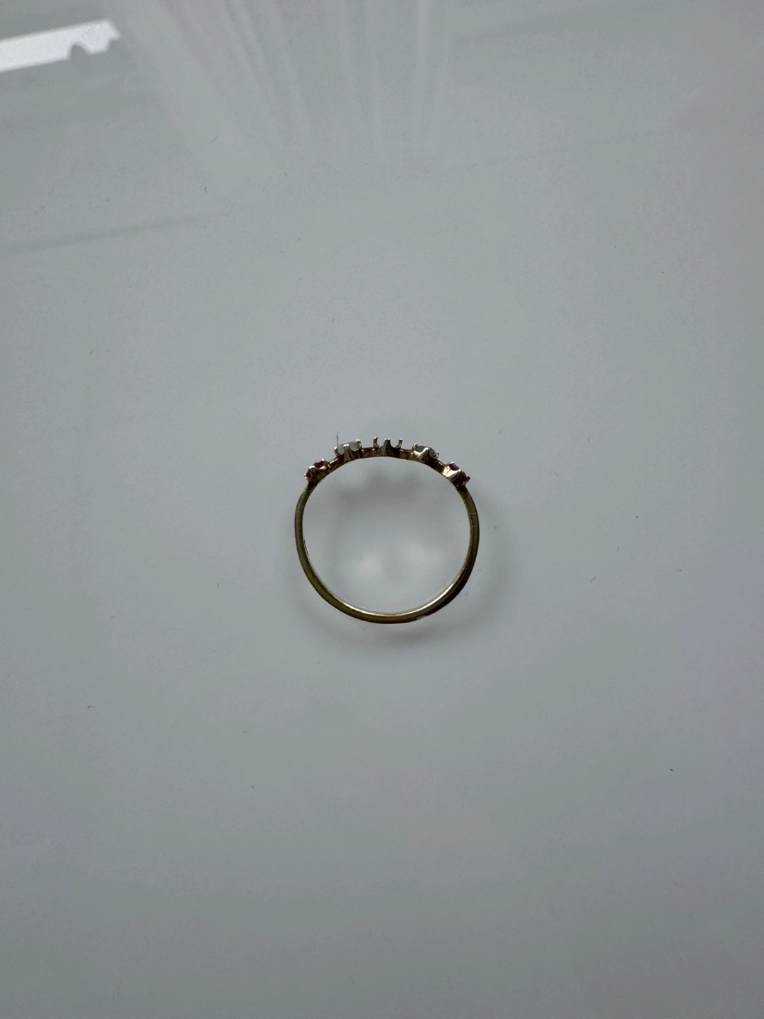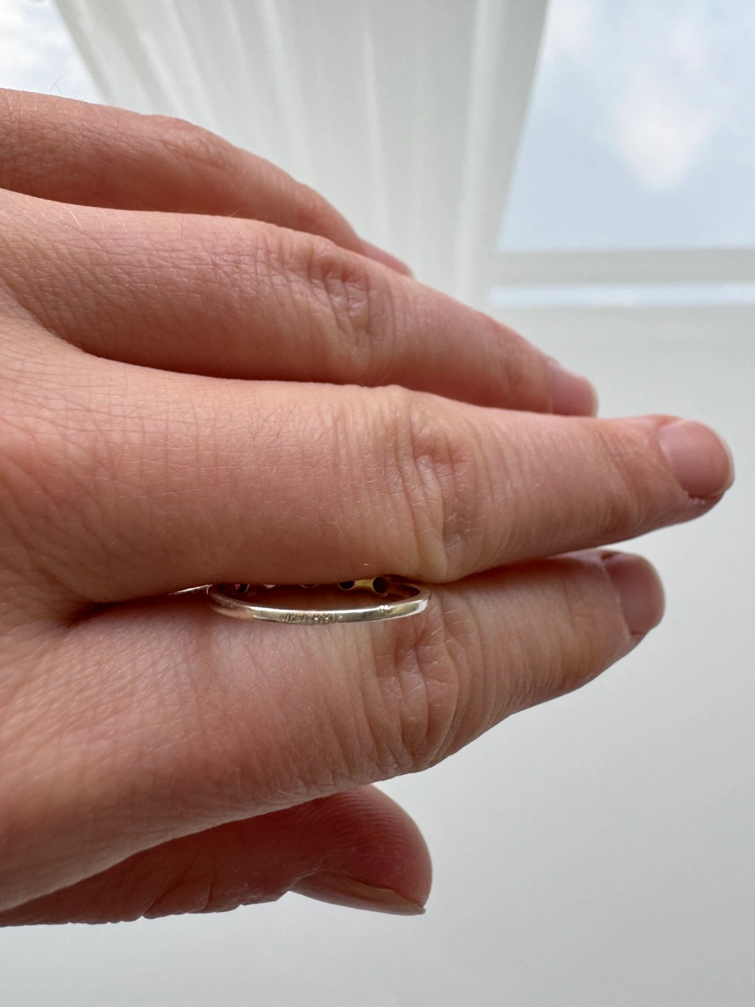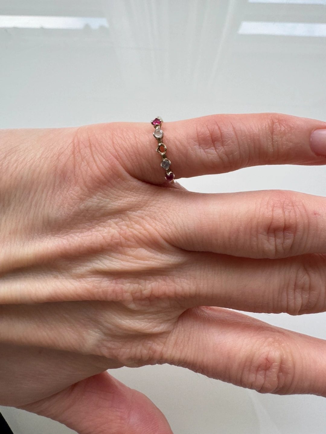 Simple gold plated sterling silver band ring. Features small, colourful gemstones. Subtle and elegant design. Perfect for everyday wear.