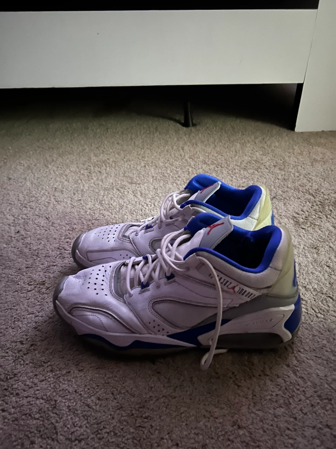 Selling a pair of Nike Air Jordan shoes in white and blue. They show signs of wear, but still have lots of life left in them! Perfect for casual wear or hitting the court, has no insoles.