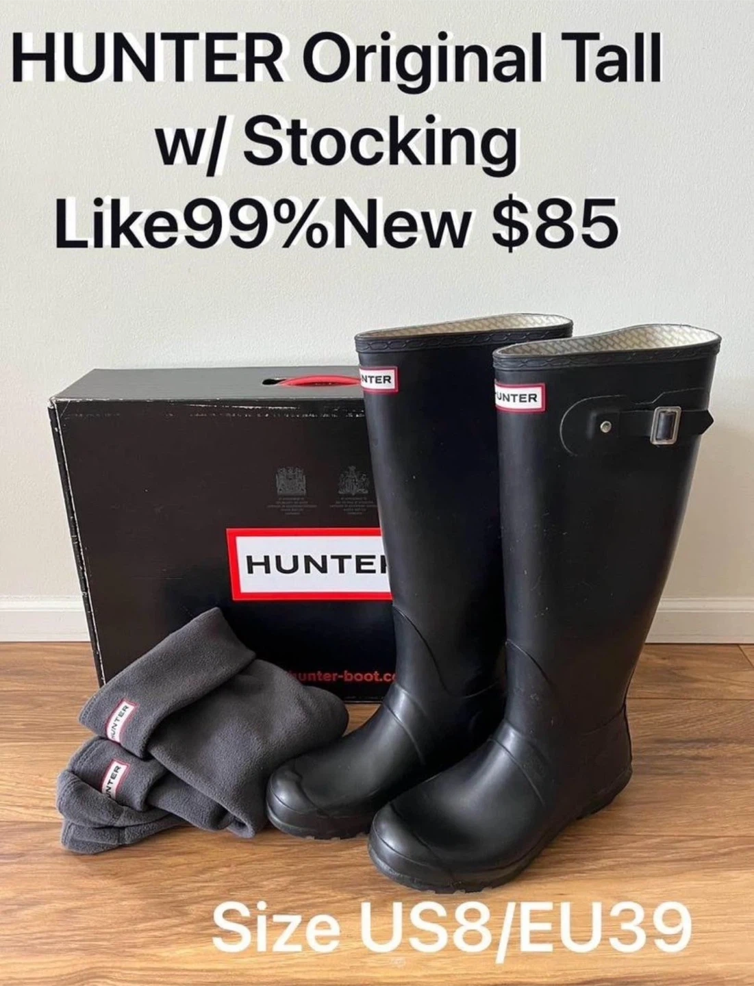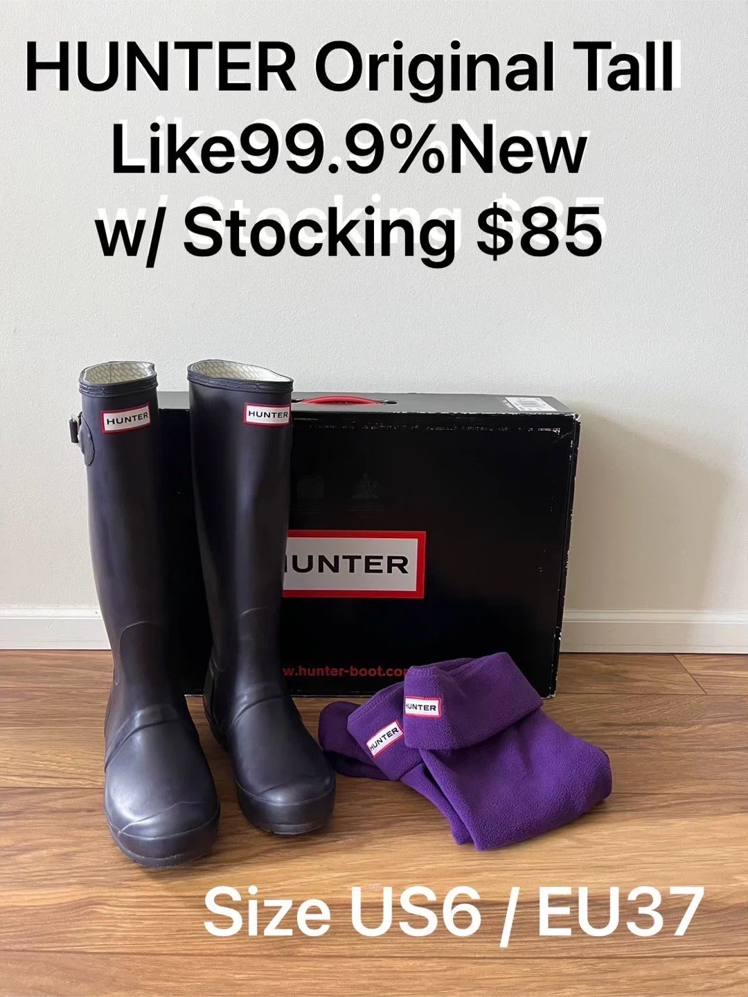 Hunter Original Tall rain boots in black. Includes purple fleece boot socks. These boots are like 99% new and are a size US 6 / EU 37.and US8/EU39. They're great for rainy days in fashion.