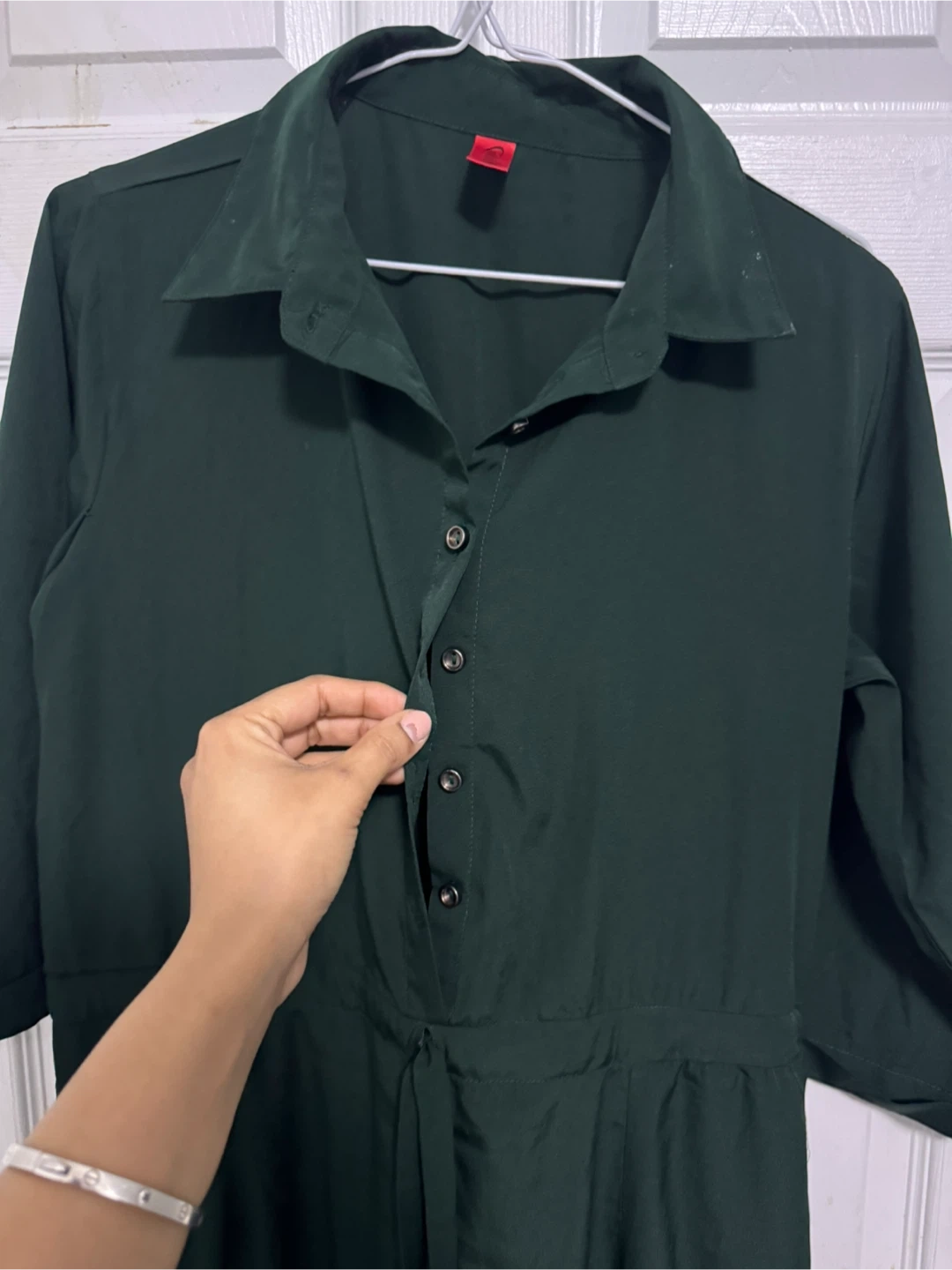 I'm selling a green jumpsuit! It's in great condition and would be a lovely addition to your wardrobe. It features a collared neck and a tie around the waist.