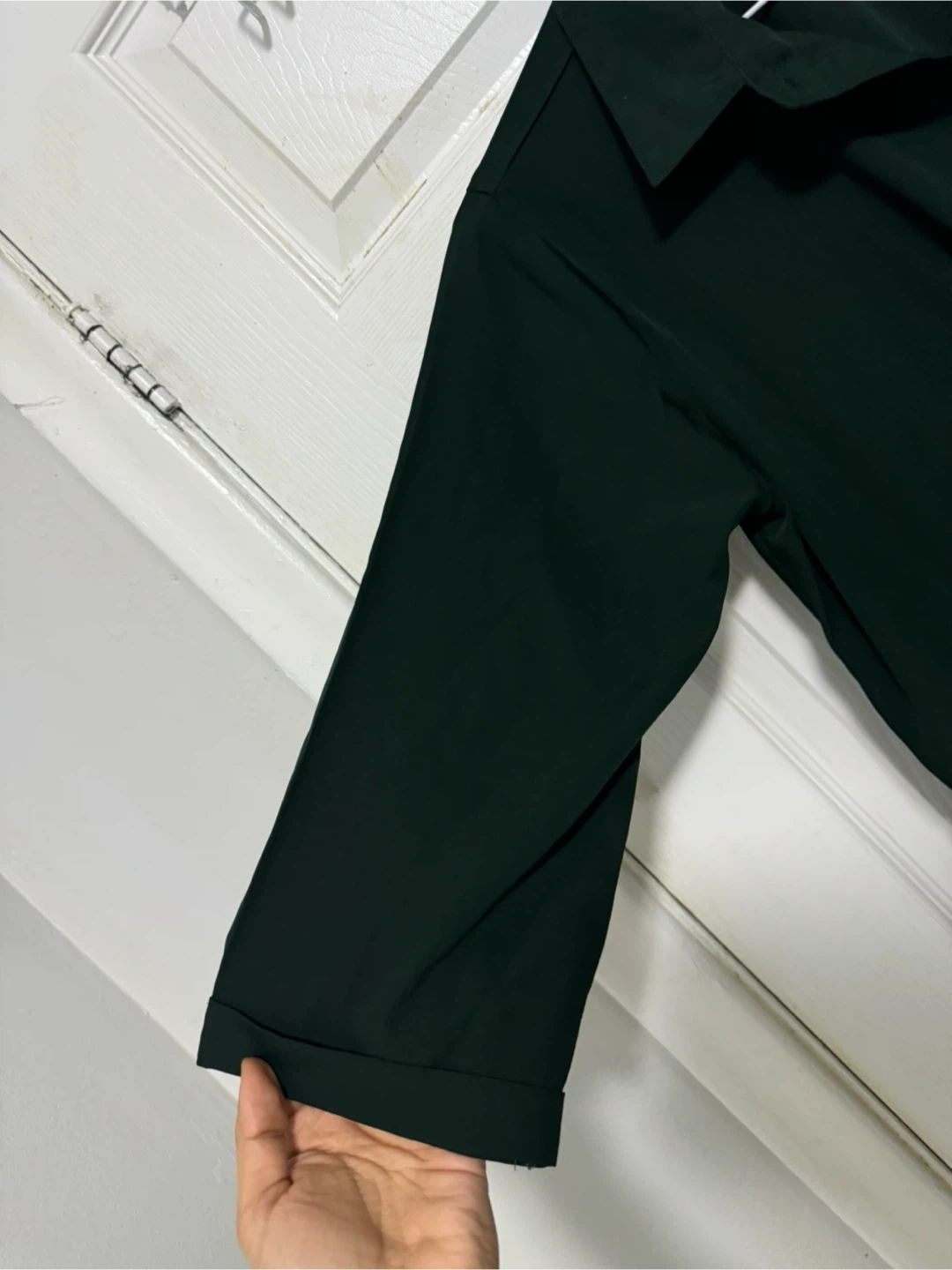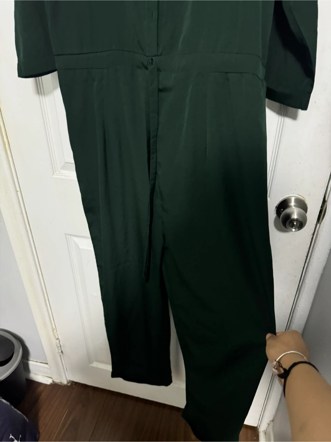I'm selling a green jumpsuit! It's in great condition and would be a lovely addition to your wardrobe. It features a collared neck and a tie around the waist.