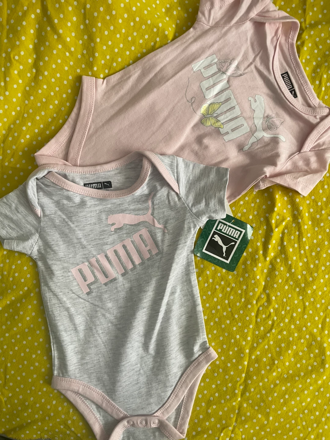 Two cute Puma baby bodysuits, one in pink with a butterfly design and the other in grey with the Puma logo.