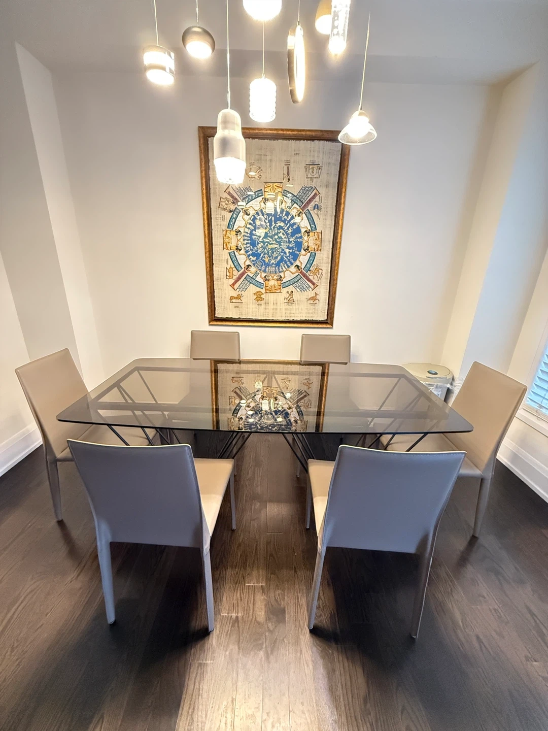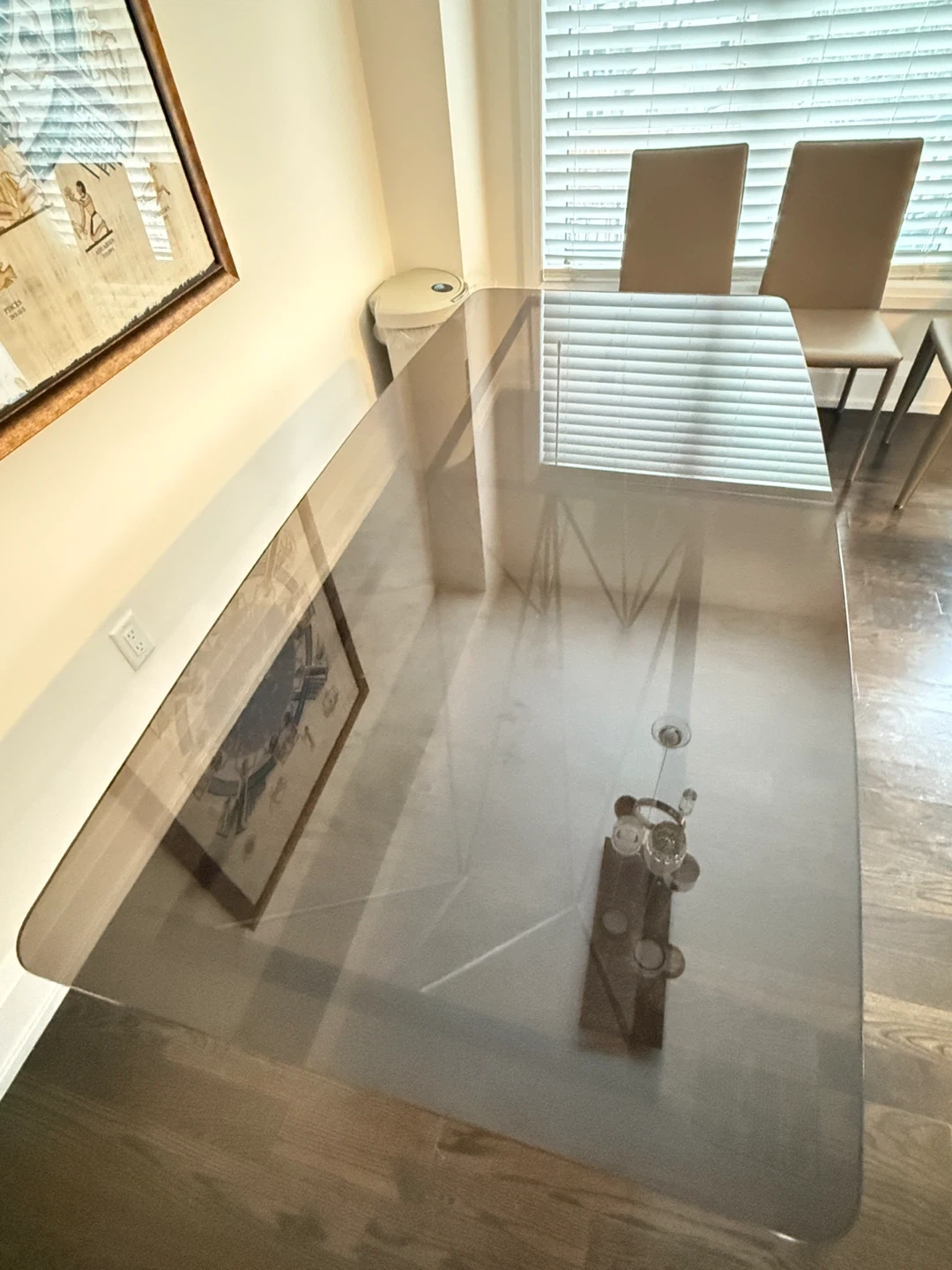The table features a very thick tempered glass top. It’s high quality, extremely sturdy, and quite heavy. with a unique geometric metal base and accompanying chairs with a beige finish. Great for a modern dining space!