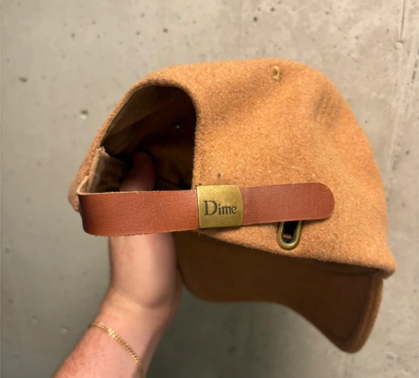 This is a tan wool baseball cap from Dime. It features an adjustable leather strap with a metal buckle for a secure fit. A classic accessory for any streetwear look!