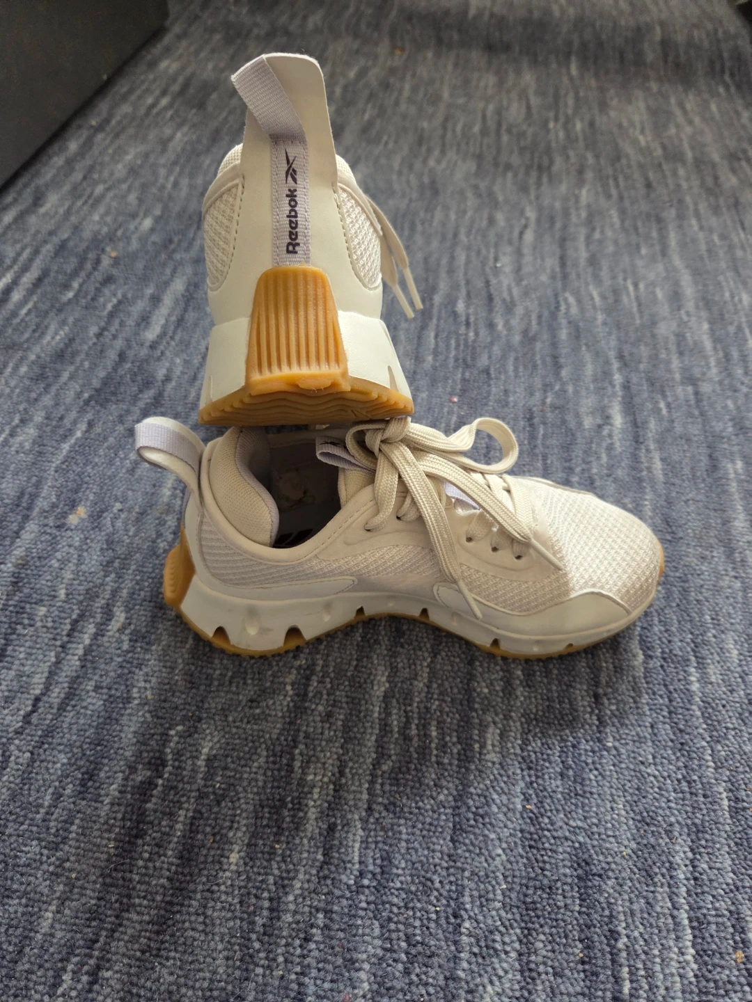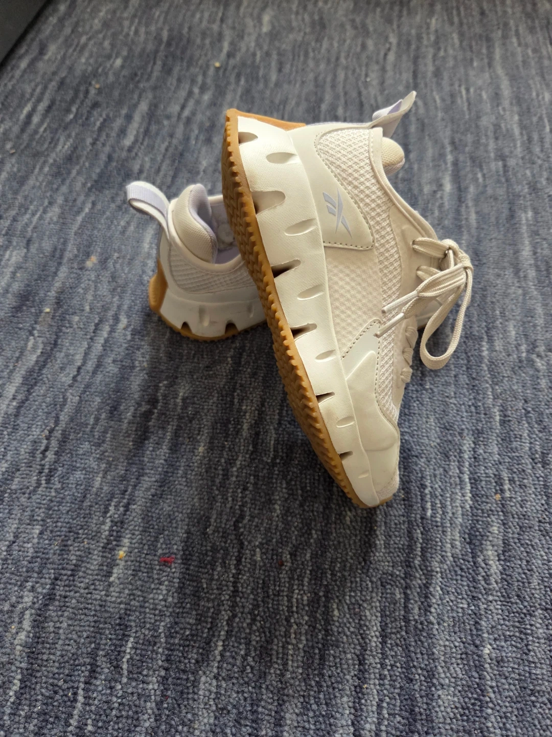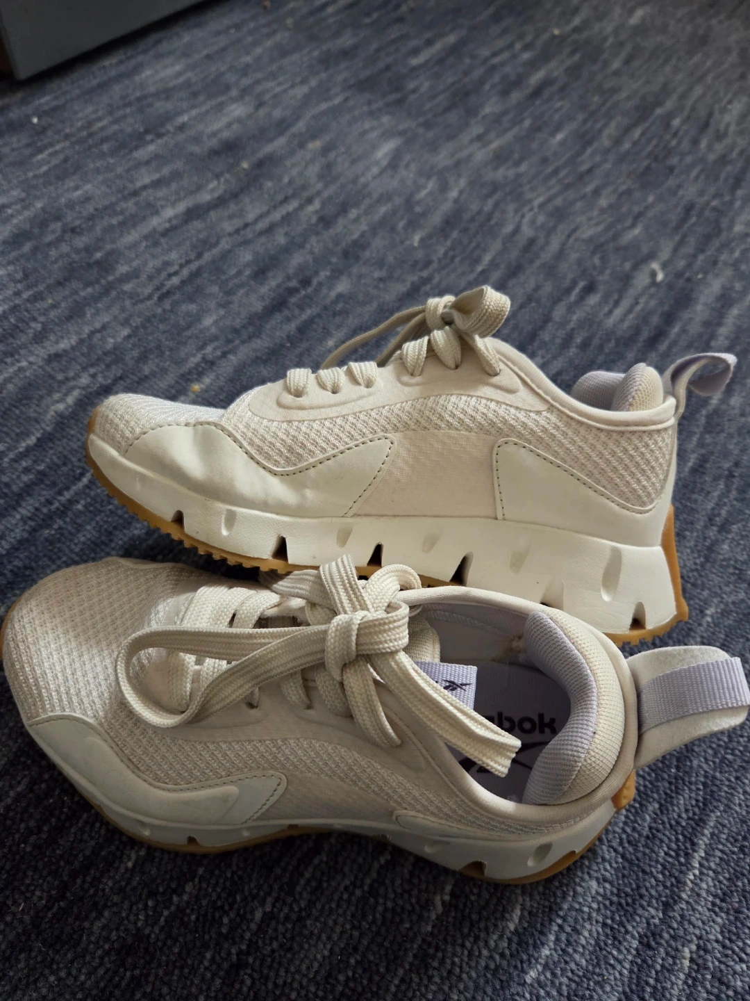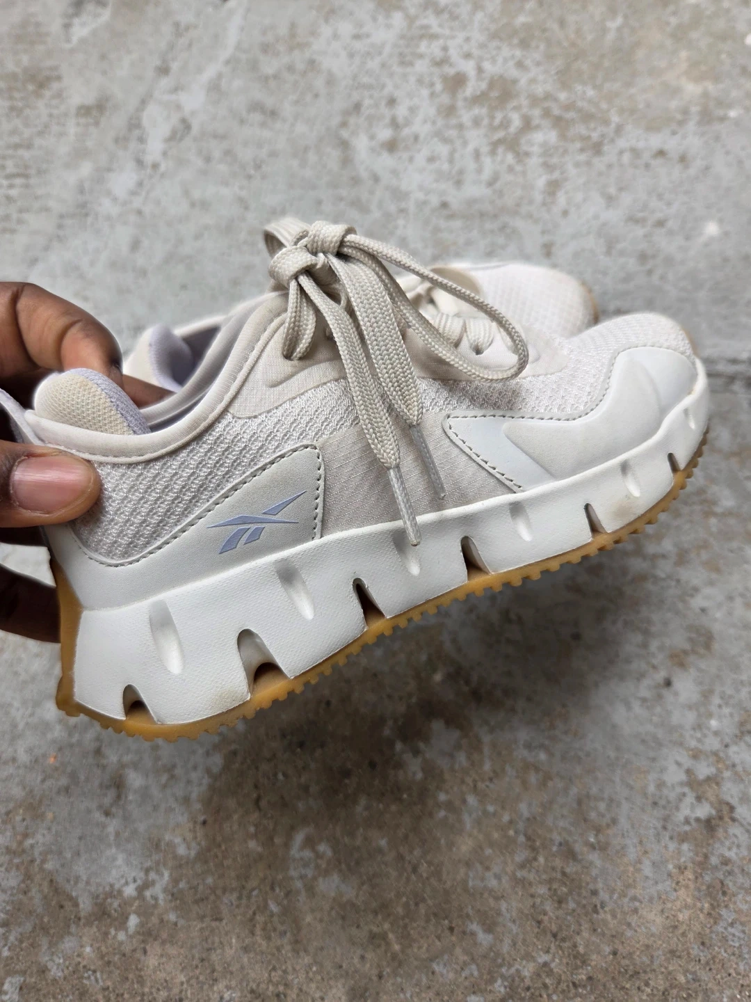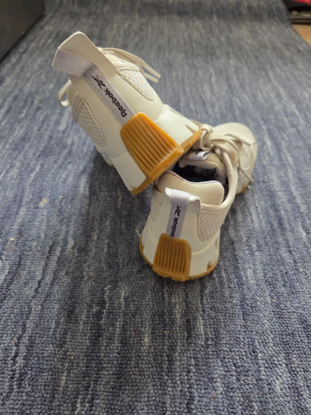 Selling a clean pair of Reebok Zig Dynamica sneakers in boy/girl Size 13. These feature the iconic zigzag energy-return sole and a sharp white-on-tan (gum) colorway that’s easy to style.