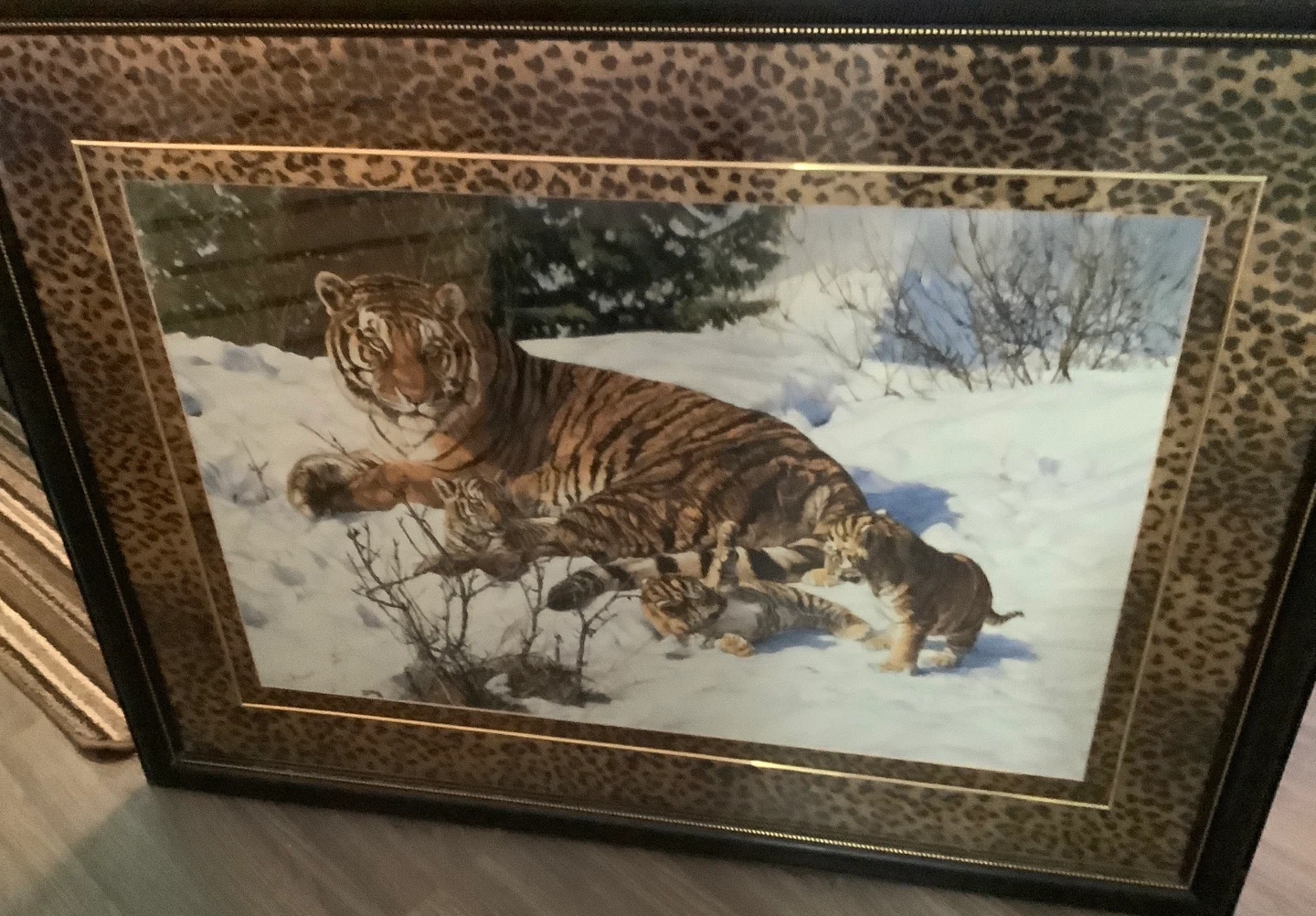 of mountain lions. The artwork is matted and housed in a frame with a leopard print design. Nice pieces for animal lovers. Small ones are 17” x 22”