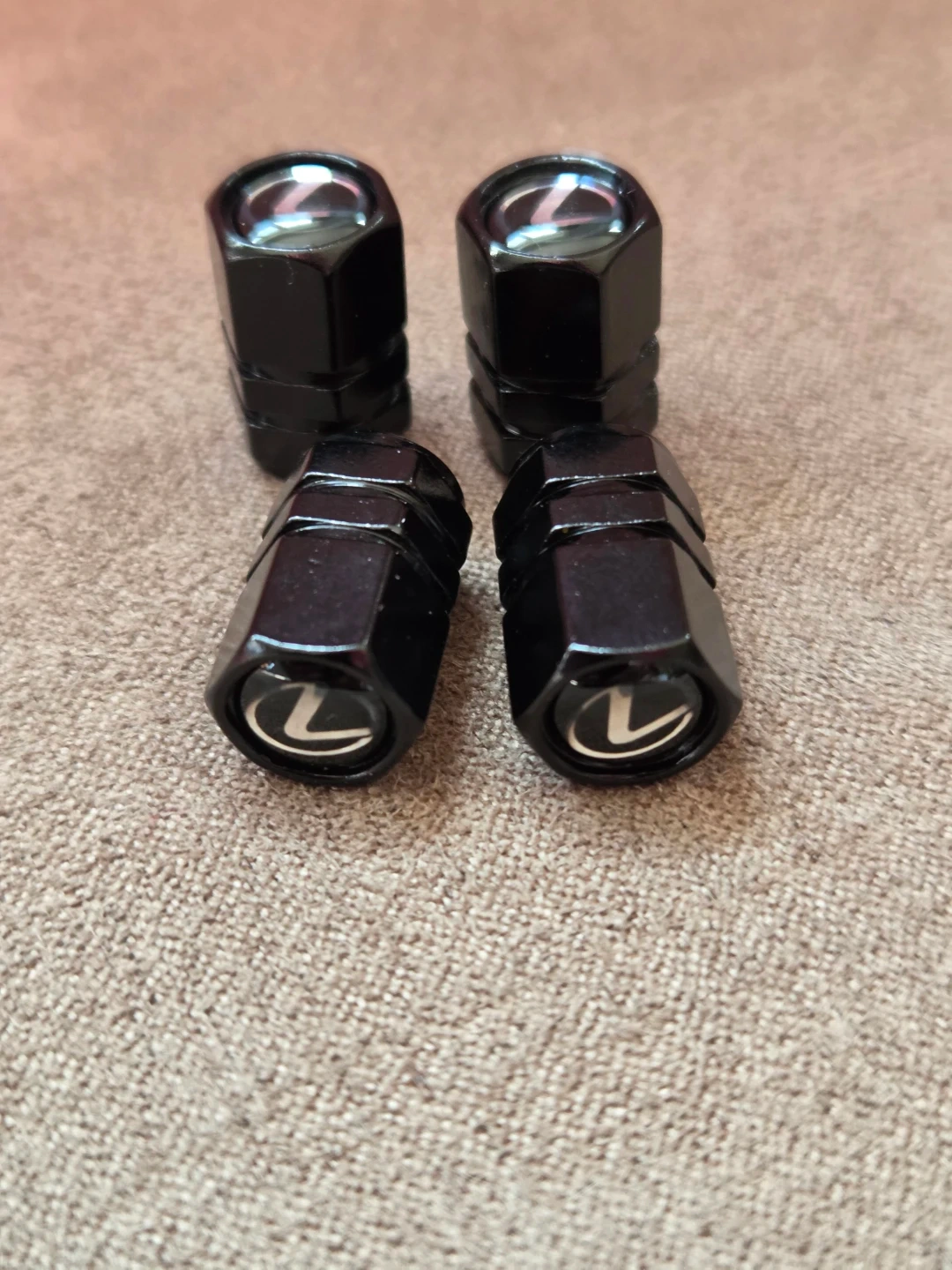 Set of four black Lexus tire valve stem caps. They're made from metal and feature the Lexus logo. These caps help protect your tire valves from dirt and moisture.