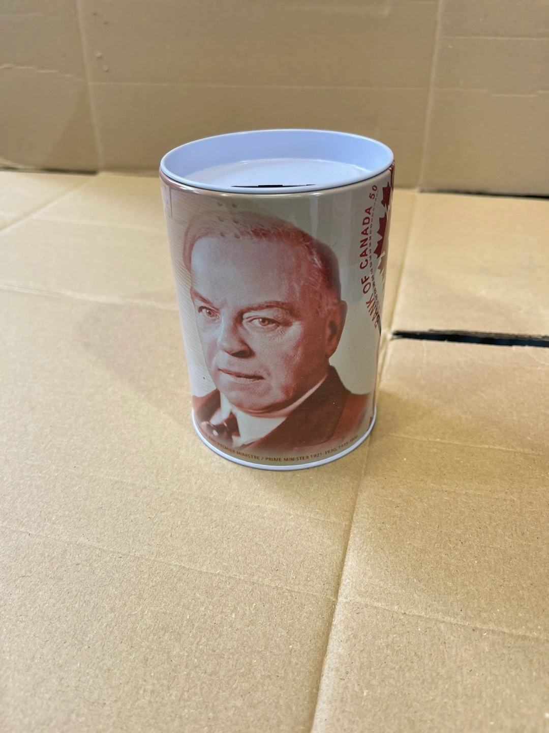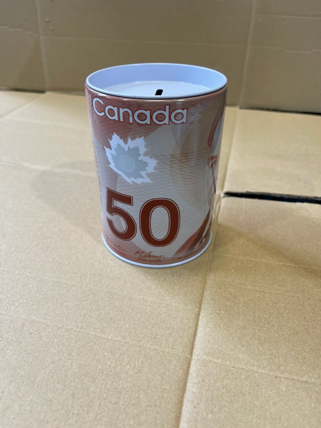 Metal coin bank. Features imagery from the Canadian $50 bill. Circular design. Small slot on top for inserting coins.