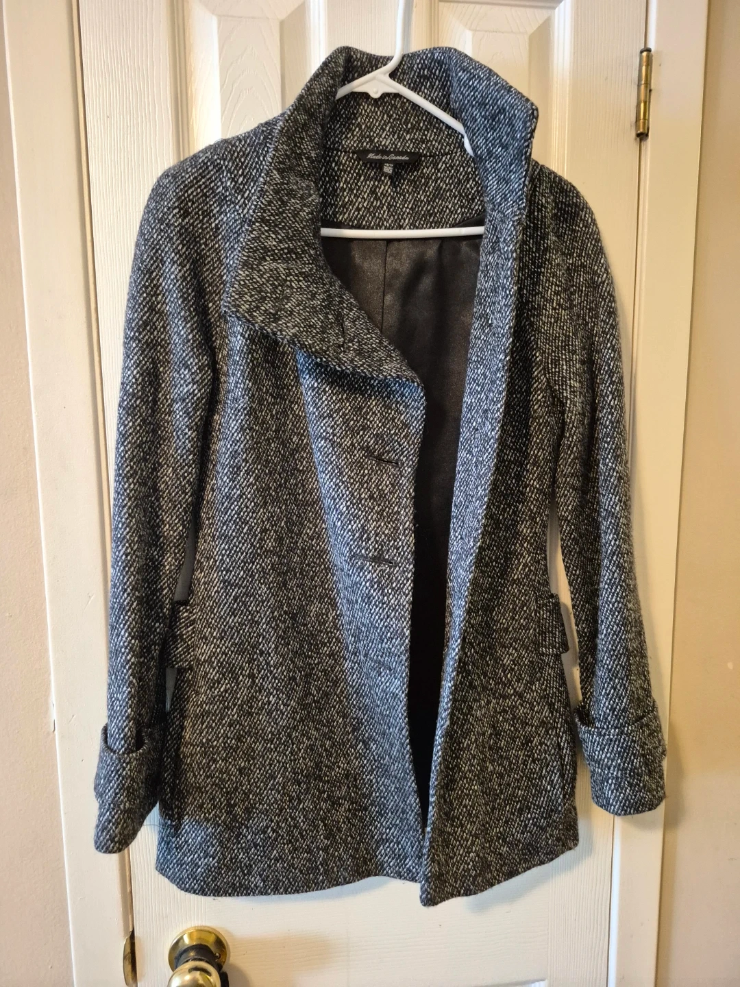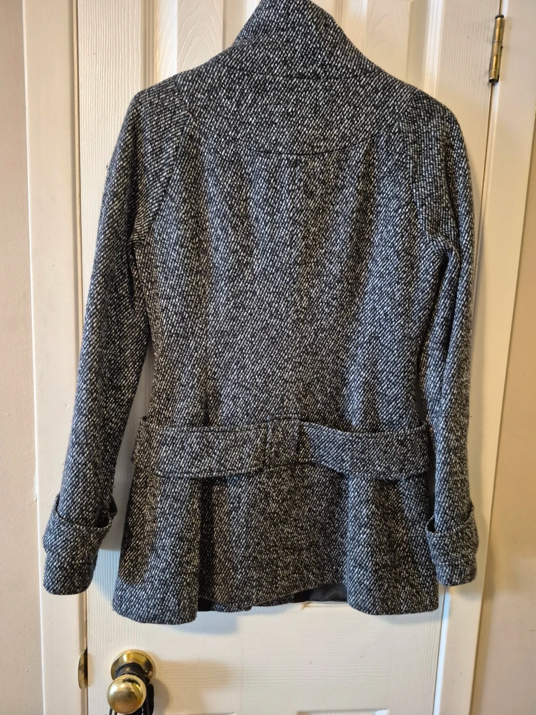 This stylish coat is made from a textured tweed blend. It features a unique asymmetrical button closure and a belted waist detail. Great for cooler weather!