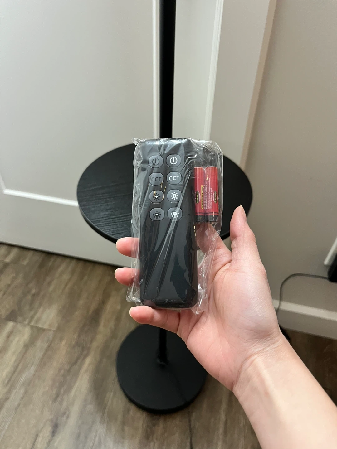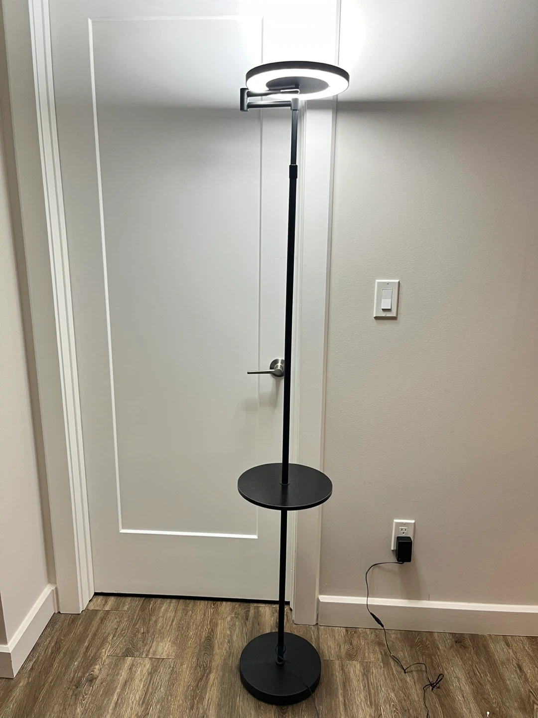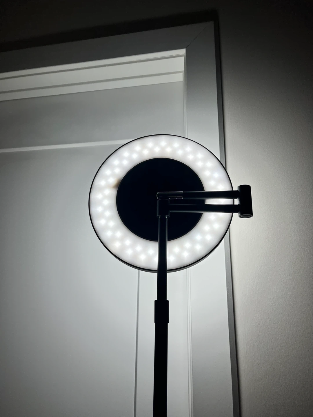 This is a black floor lamp featuring a ring light at the top and a convenient shelf in the middle. It comes with a remote control for easy adjustments. The light has adjustable colour temperature settings, perfect for creating different ambiances. It's a stylish and functional addition to any room!