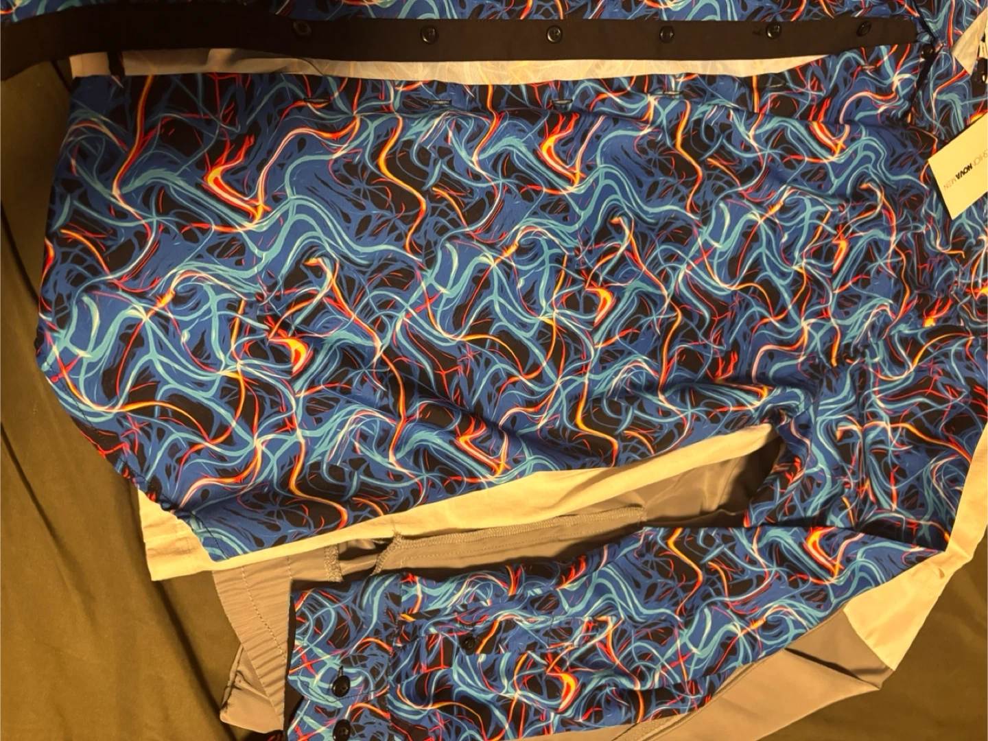This is a Fashion Nova men's long-sleeve button-up shirt. It features a bold blue, red, and orange swirl pattern on a black background. The shirt has a black collar and button placket. Material is polyester.