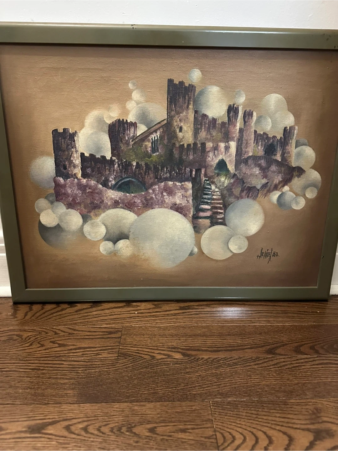 This framed painting depicts a whimsical castle surrounded by soft clouds. The artwork has a unique, dreamlike quality. It's signed on the right side with what appears to be a date. This piece would add a touch of fantasy to any room!