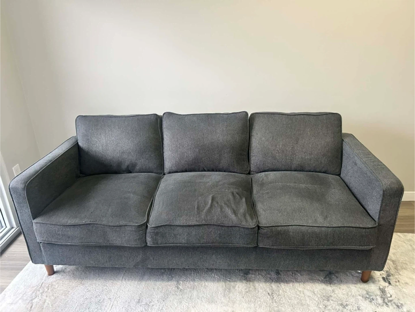 This is a three-seater grey fabric sofa. It features a modern design with clean lines and comfortable cushions. The sofa's upholstery is a durable fabric, and it sits on wooden legs. Ready for pick up.