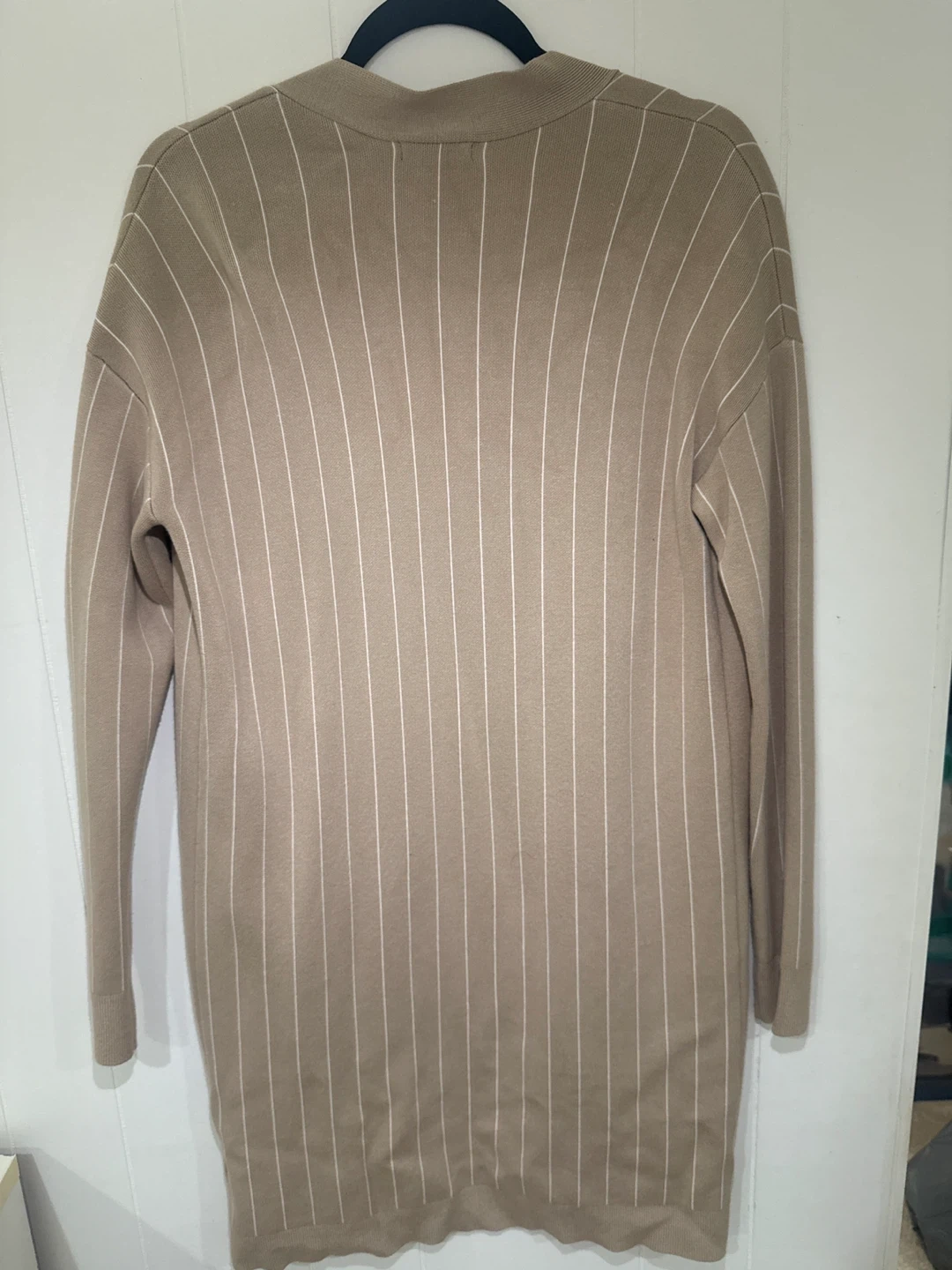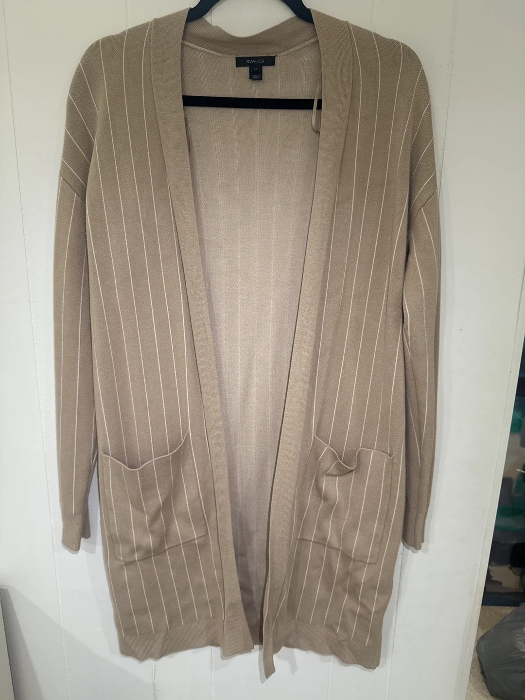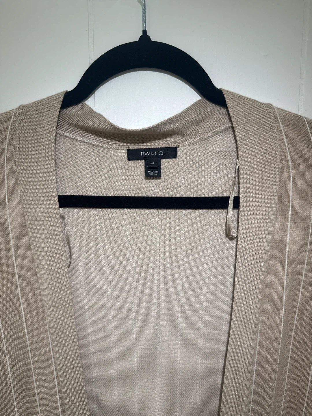 15Cozy RW&CO. cardigan in a lovely beige colour with subtle white stripes! It's a size small and made of a comfortable material. Perfect for layering on cooler days!