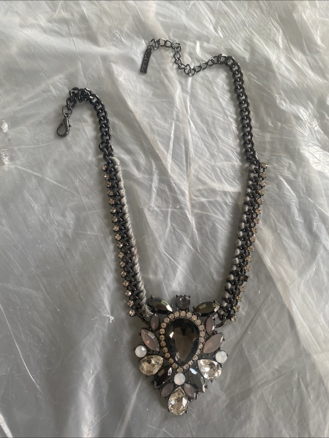 RW&CO statement necklace with a gunmetal chain and a large decorative pendant. It's in great condition and would add a touch of glam to any outfit!