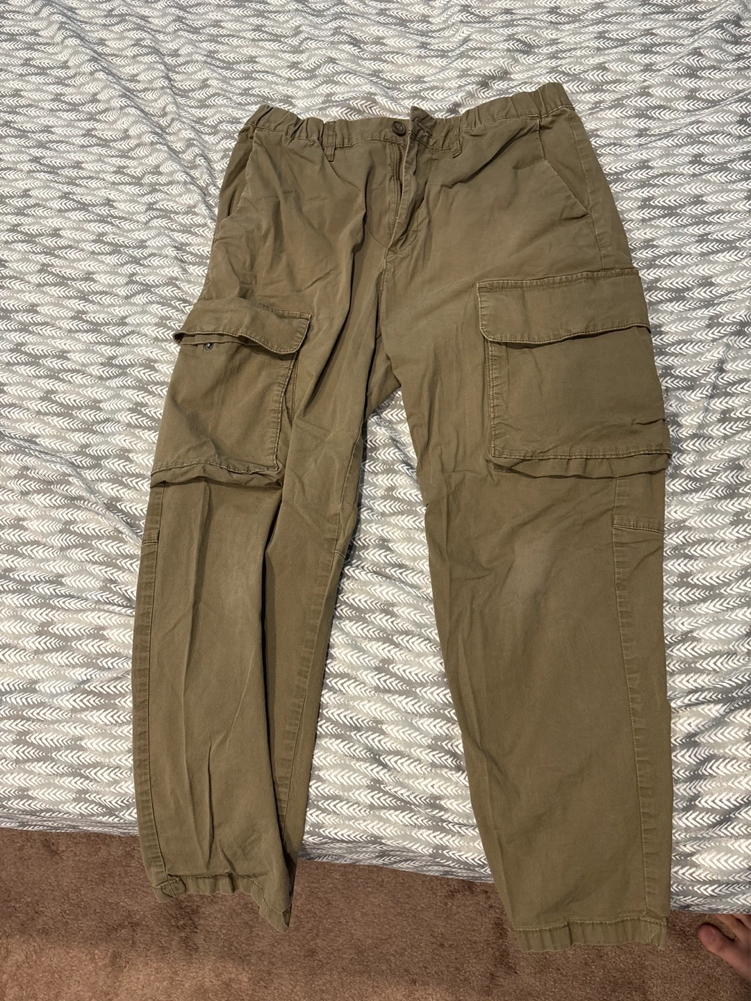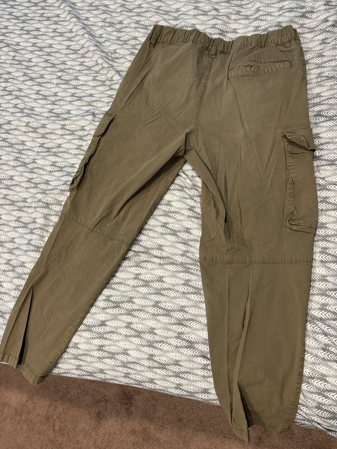 GU cargo pants in a khaki colour. Men's size medium. Made with a blend of cotton and spandex. These pants feature multiple utility pockets and an elastic waistband.