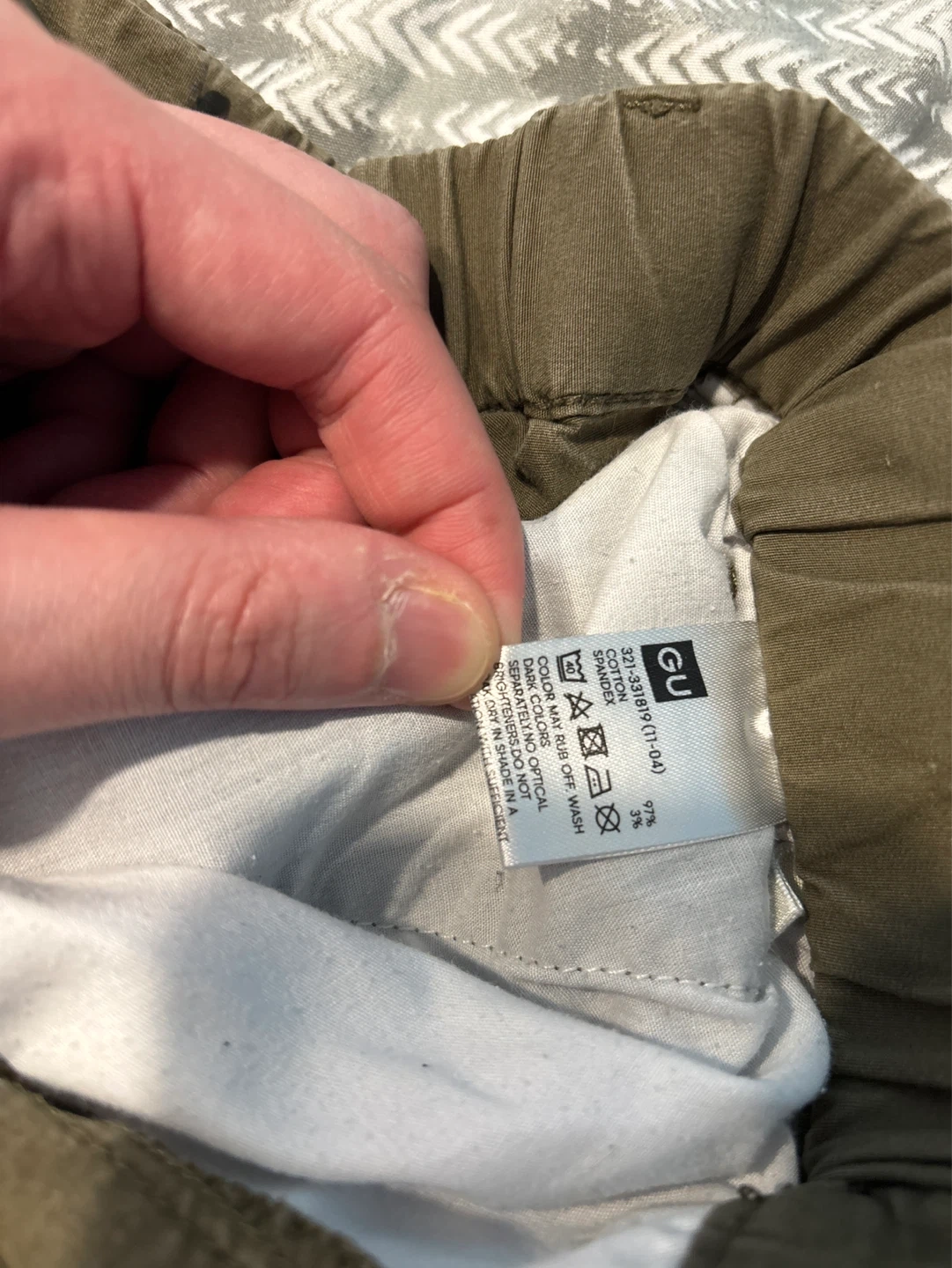 GU cargo pants in a khaki colour. Men's size medium. Made with a blend of cotton and spandex. These pants feature multiple utility pockets and an elastic waistband.