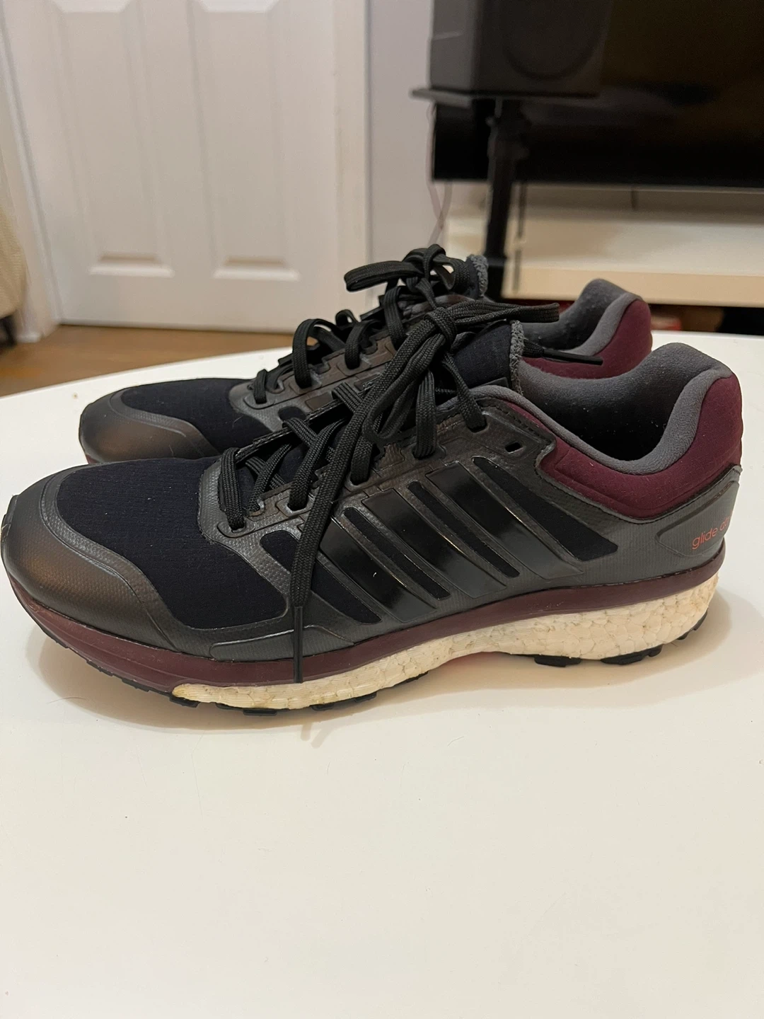 Adidas Supernova Glide running shoes in black and burgundy. US size 8, UK 7.5, EU 40. Made in Indonesia. Features Boost cushioning and Continental rubber outsole. These are great for road running! For both men & women.