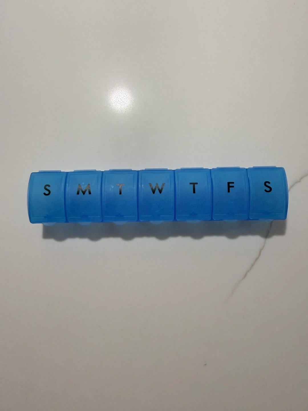 This blue weekly pill organizer has compartments labelled for each day of the week, from Sunday to Saturday. Plastic construction.