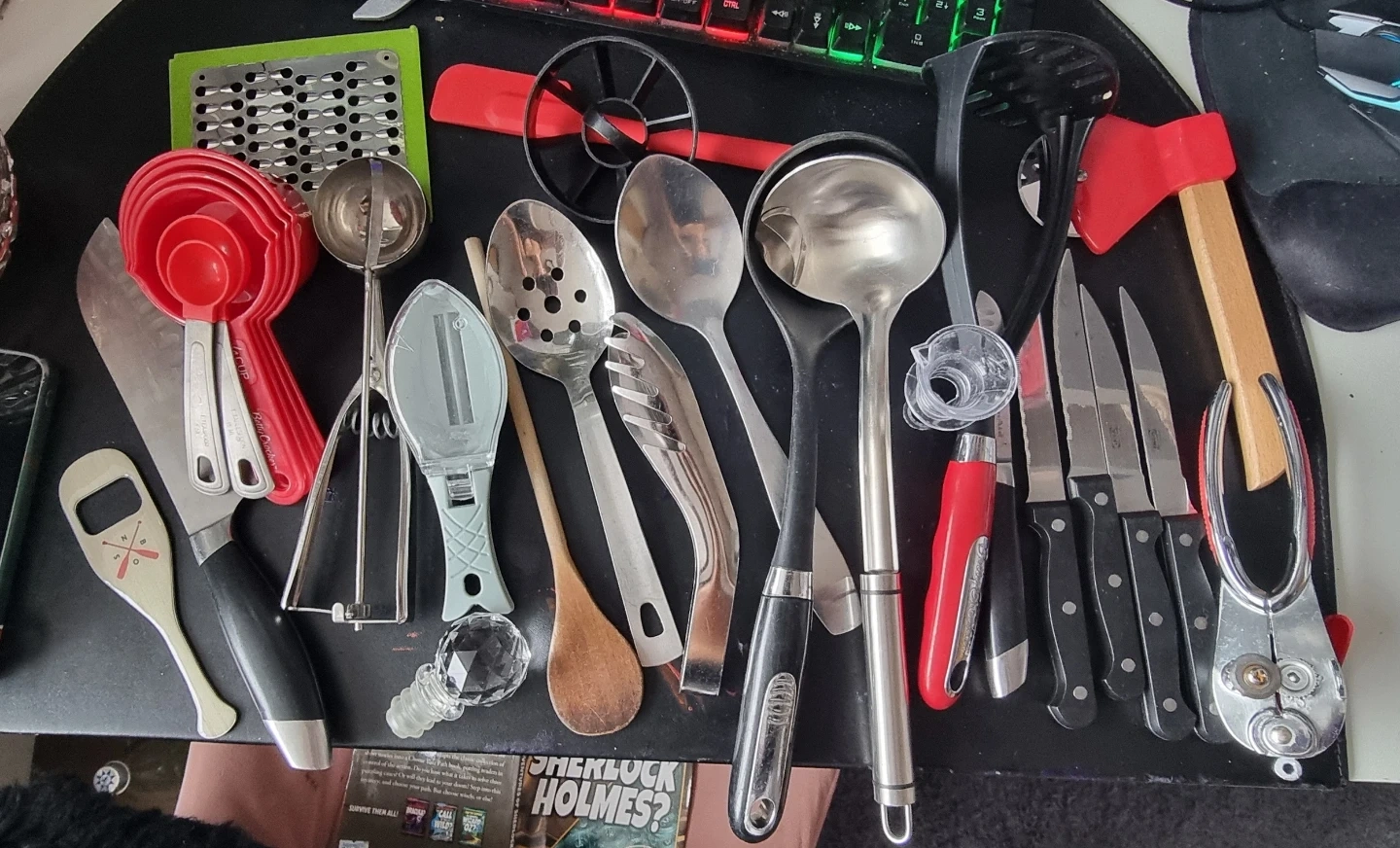 Selling a variety of kitchen utensils! This set includes spoons, knives, measuring cups, and other handy tools for cooking and baking.