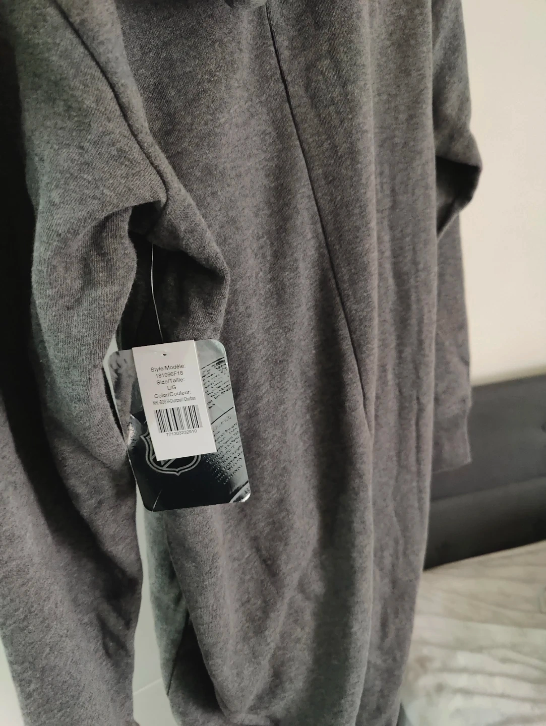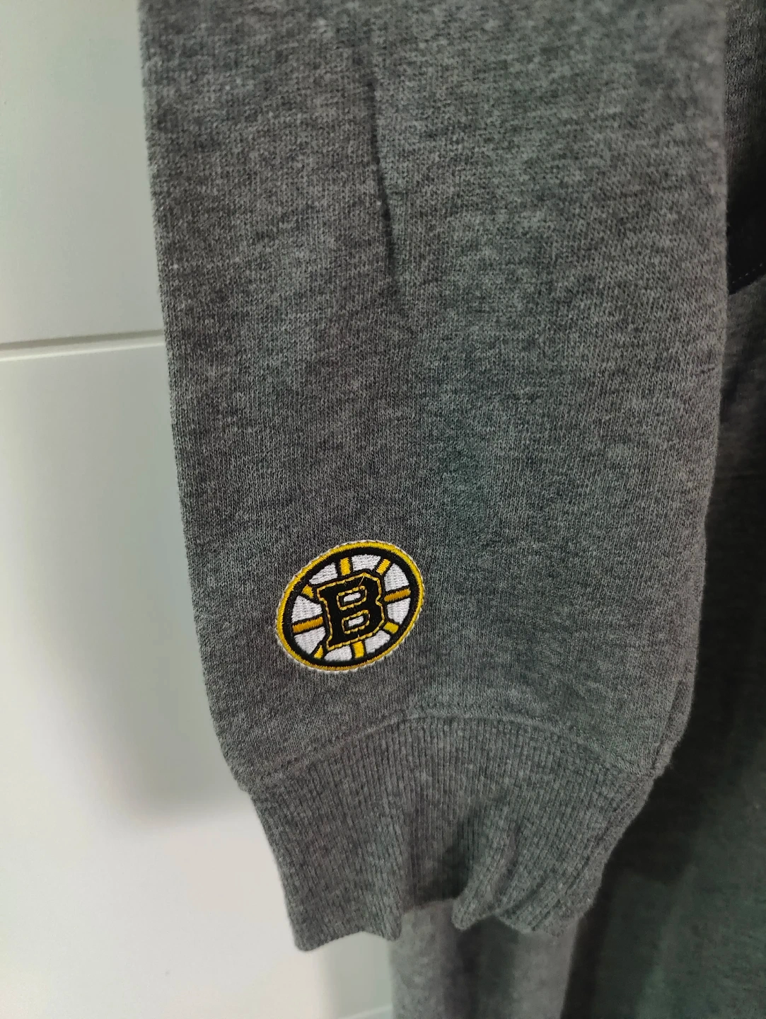 This grey onesie features the Boston Bruins logo and text. It's made of 60% cotton and 40% polyester. Officially licensed NHL product. Size is Large.