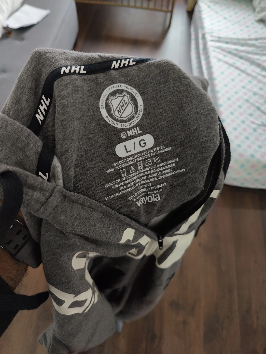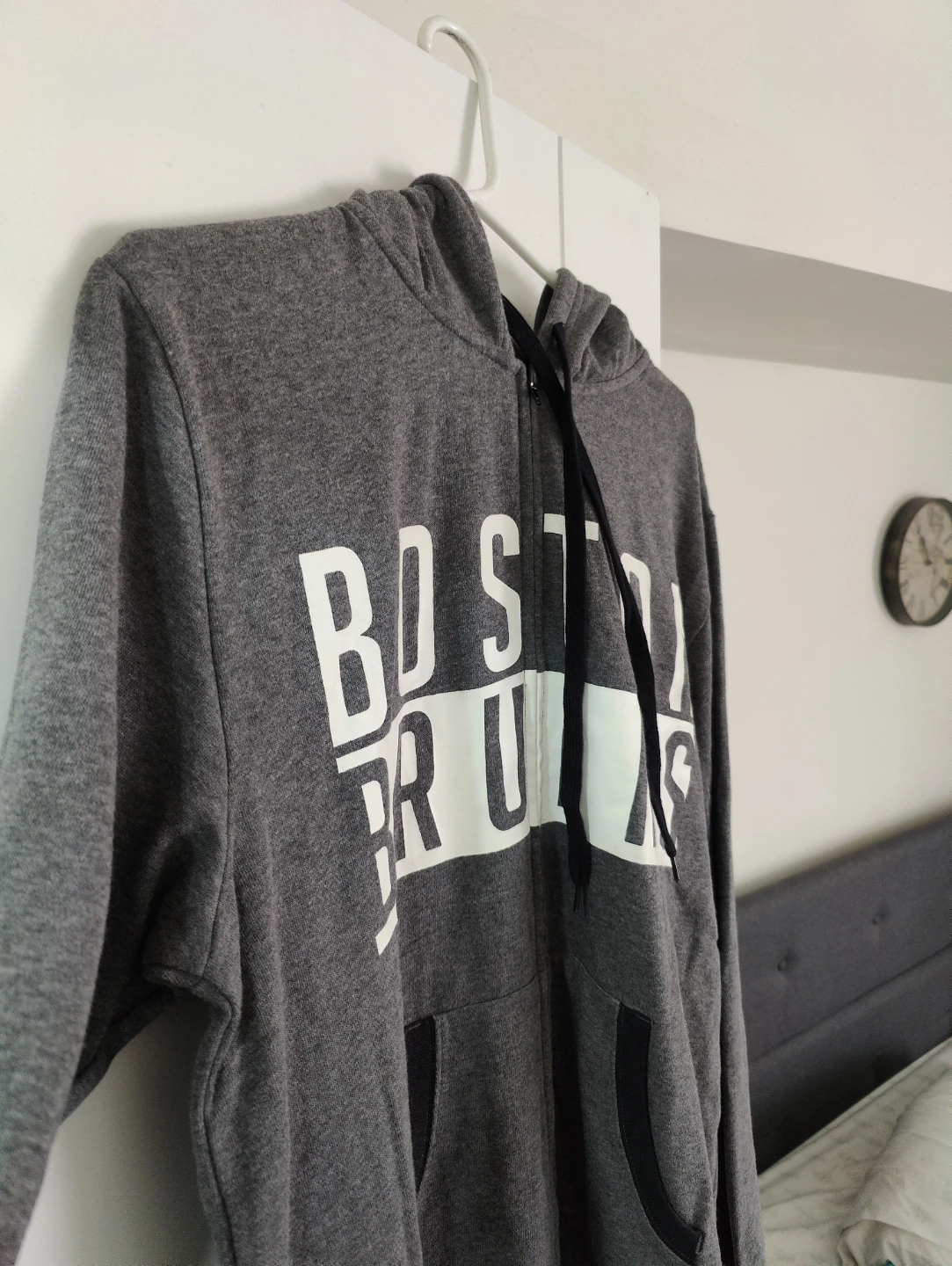 This grey onesie features the Boston Bruins logo and text. It's made of 60% cotton and 40% polyester. Officially licensed NHL product. Size is Large.