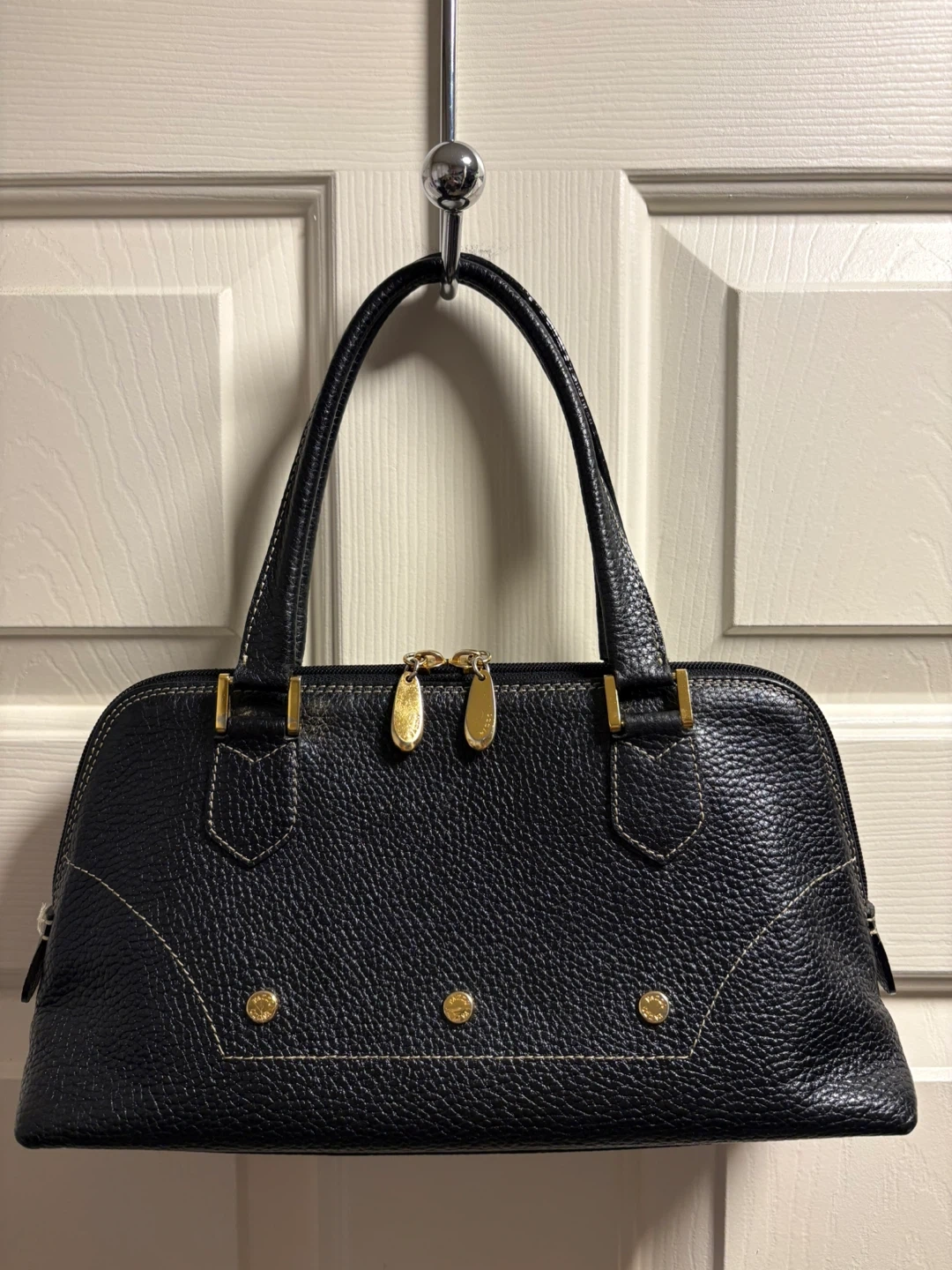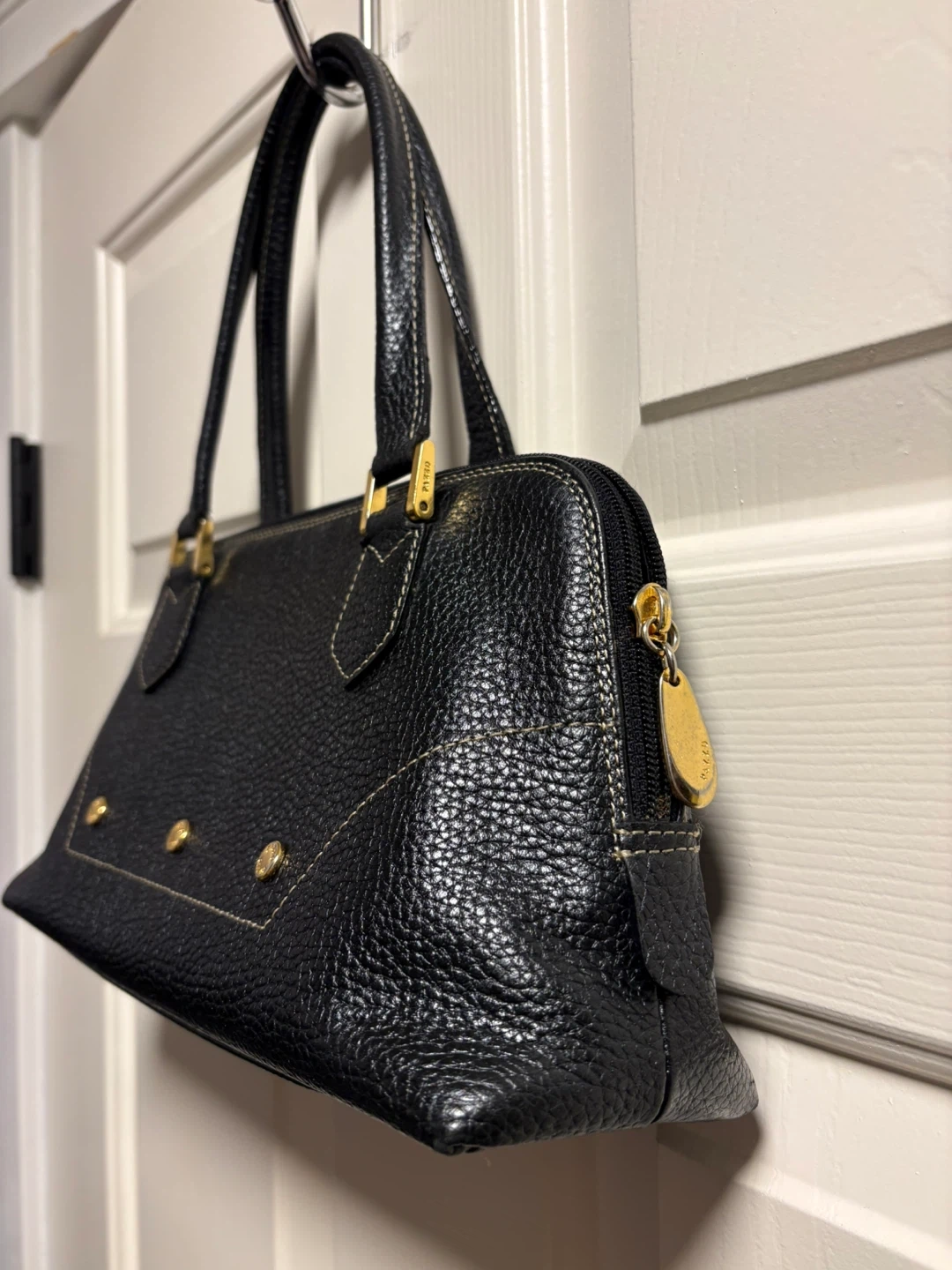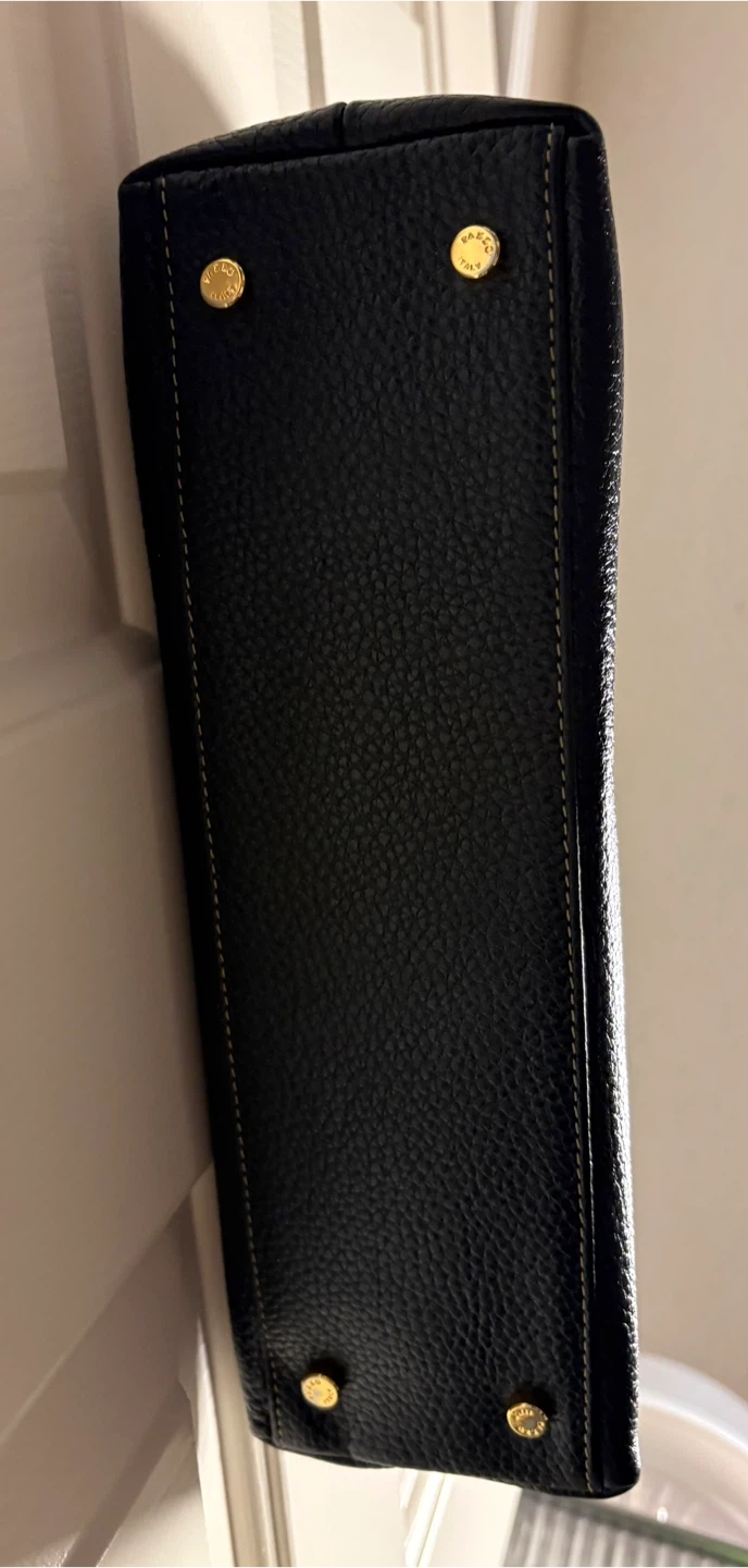 A classic black pebbled leather handbag by PAZZO ITALY. It features gold-tone hardware and a zip-top closure. This Italian-made purse is crafted from genuine leather. Beautiful and classy handbag in great condition, just like new! Pick up in Chestermere.