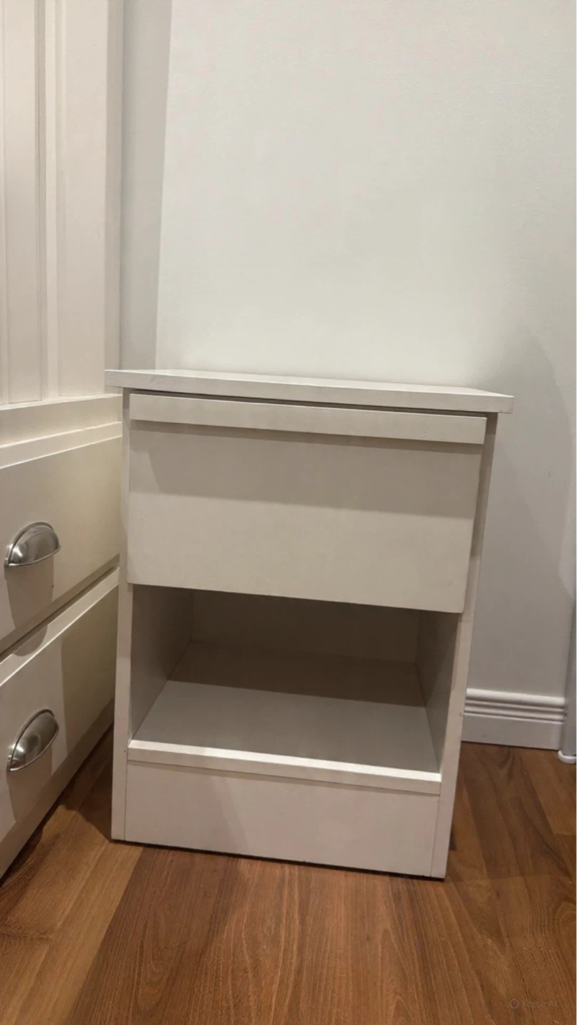 A clean white bedside table featuring one drawer and an open shelf below. Its simple design fits well in any bedroom.