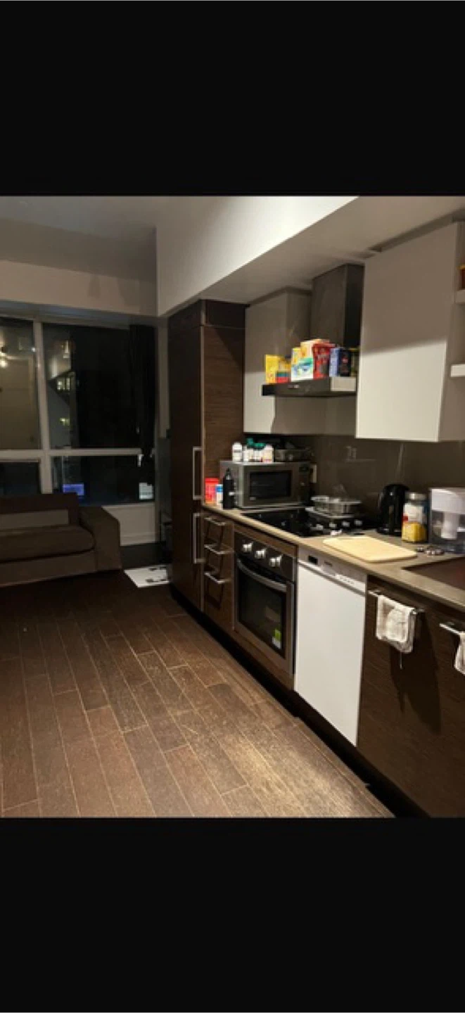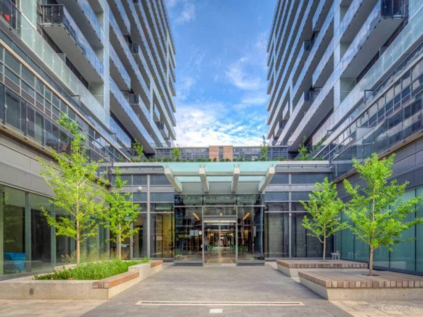 Modern condo building located at 1030 King Street West, Toronto. Features contemporary architecture and commercial spaces on the ground floor. Convenient urban location with easy access to amenities. Great for city living!