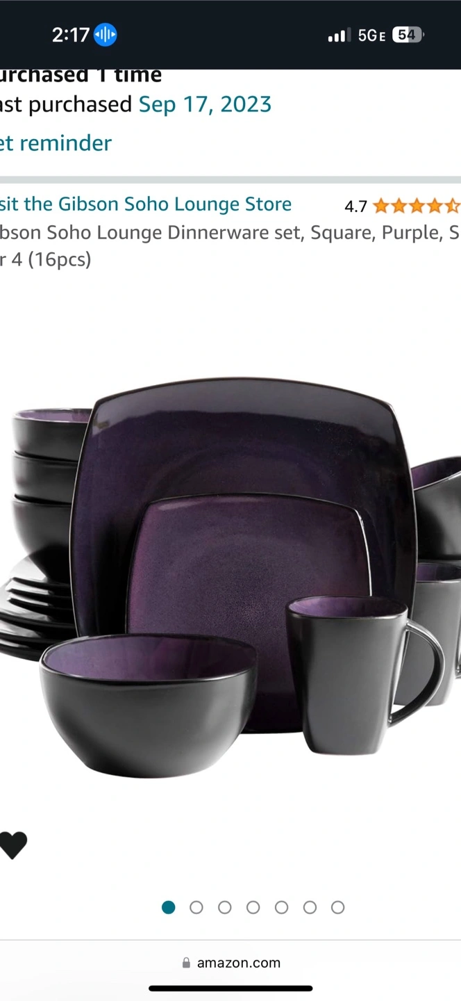 Square shaped plates. Bowls, cups included. It features a striking purple color. A lovely set to make your dinner feel like a special occasion. Brand new in box. I have 2 sets each $20.00