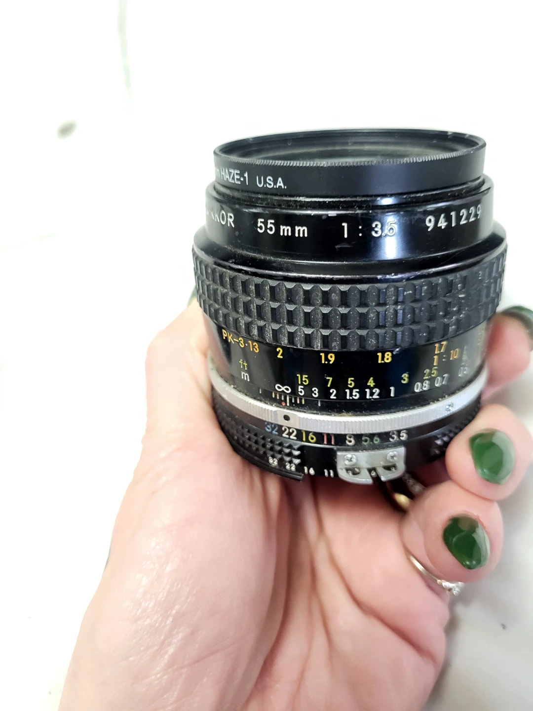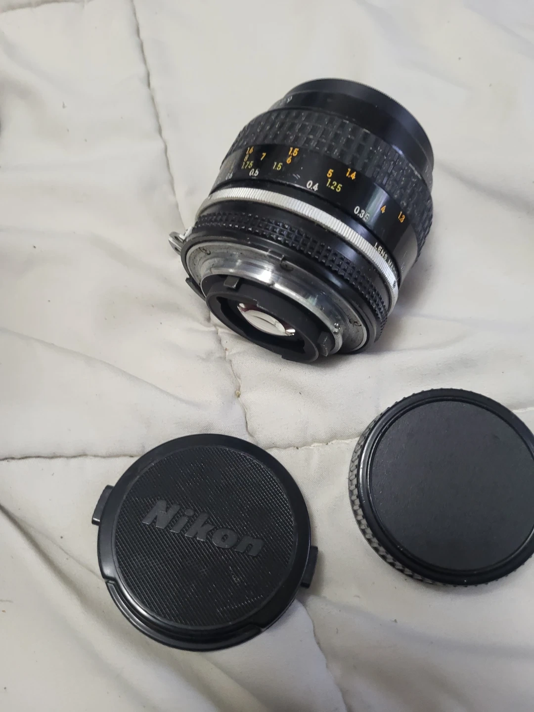 This is a Nikon 55mm f/3.5 macro lens. It's made in the U.S.A. and includes a protective filter. Two lens caps are also included.