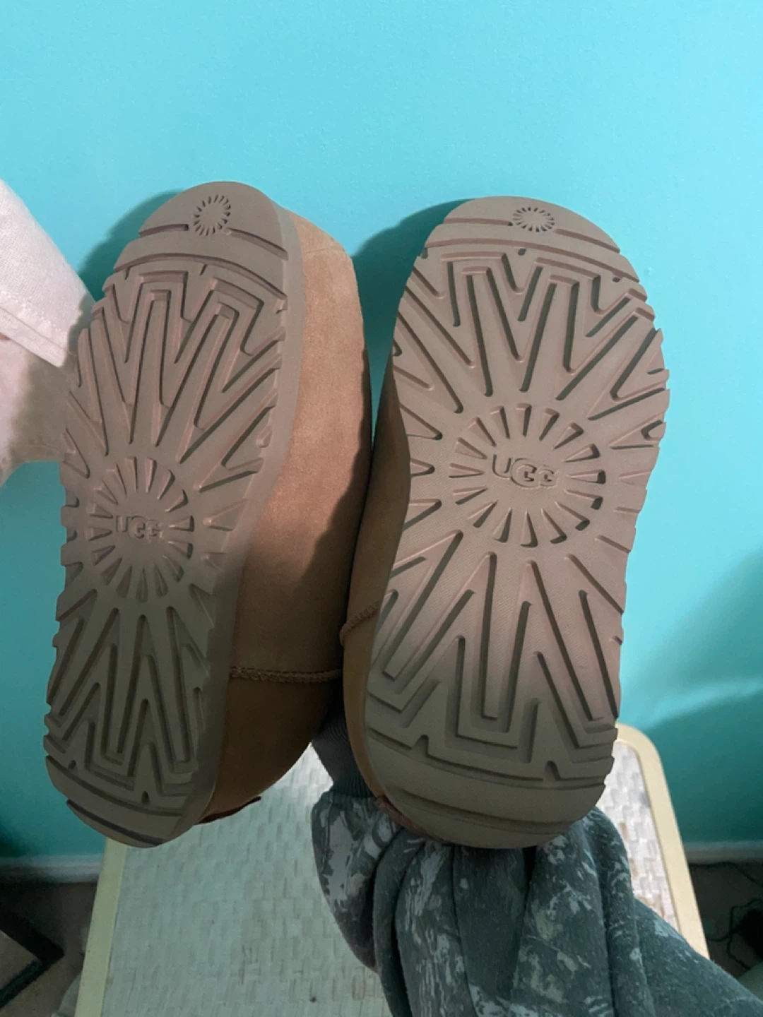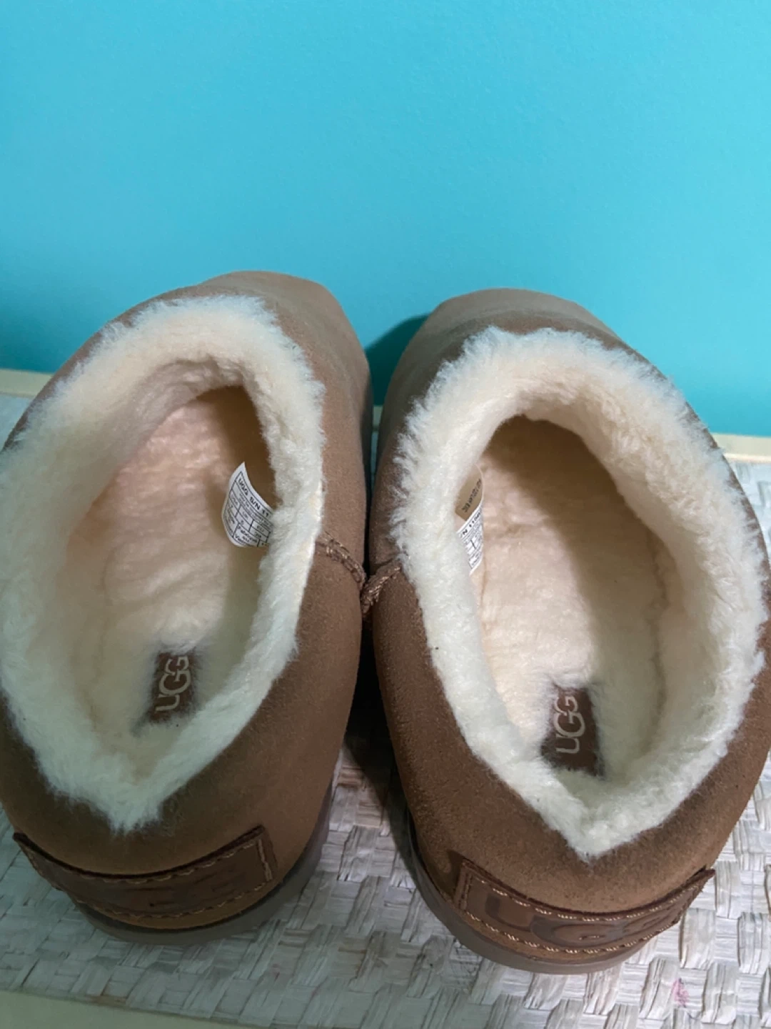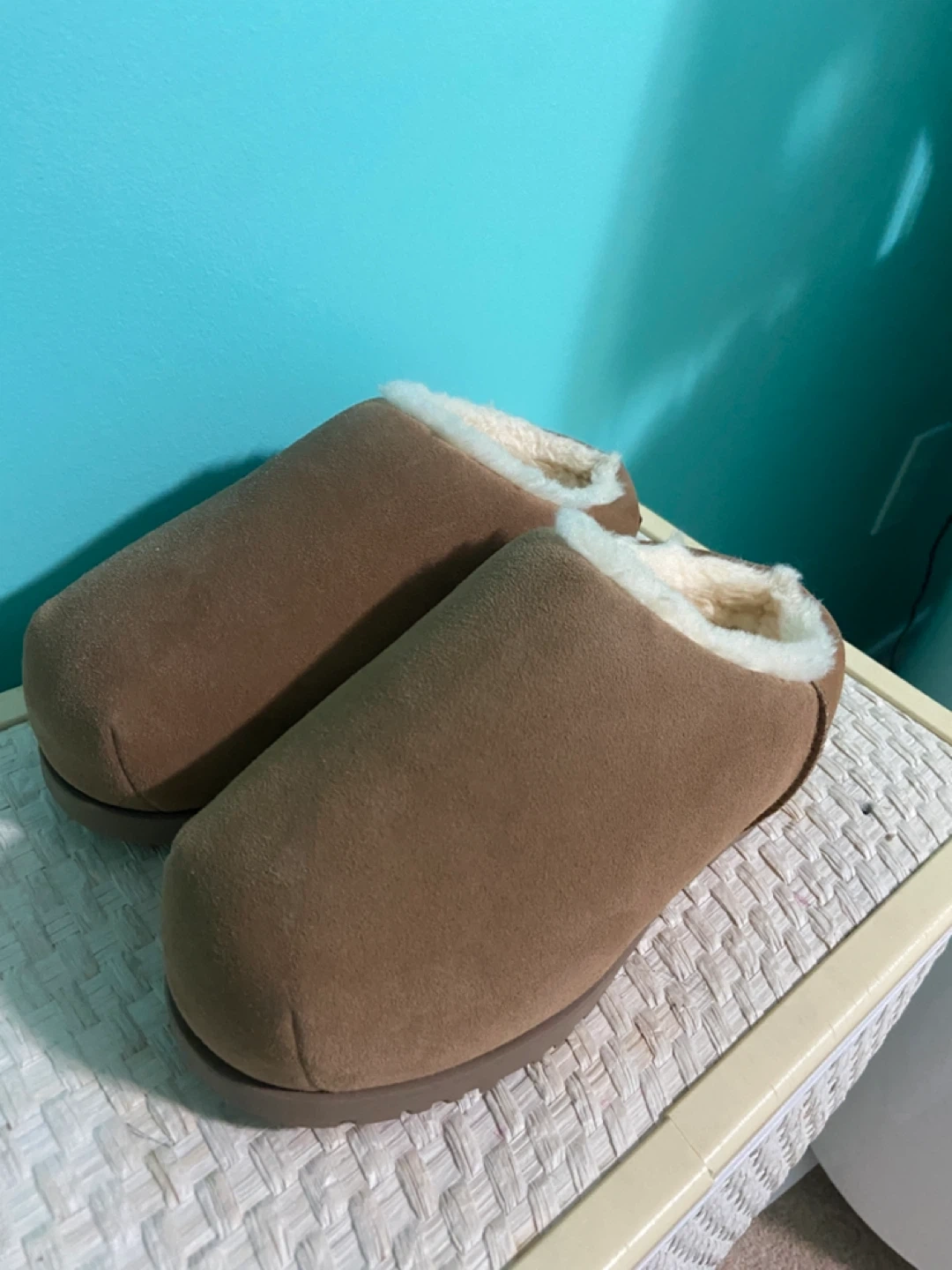 Cozy Ugg slippers in a Chestnut colour. These are a women's size 7, featuring a soft sheepskin lining and a comfortable sole. Perfect for keeping your feet warm indoors or outdoors!