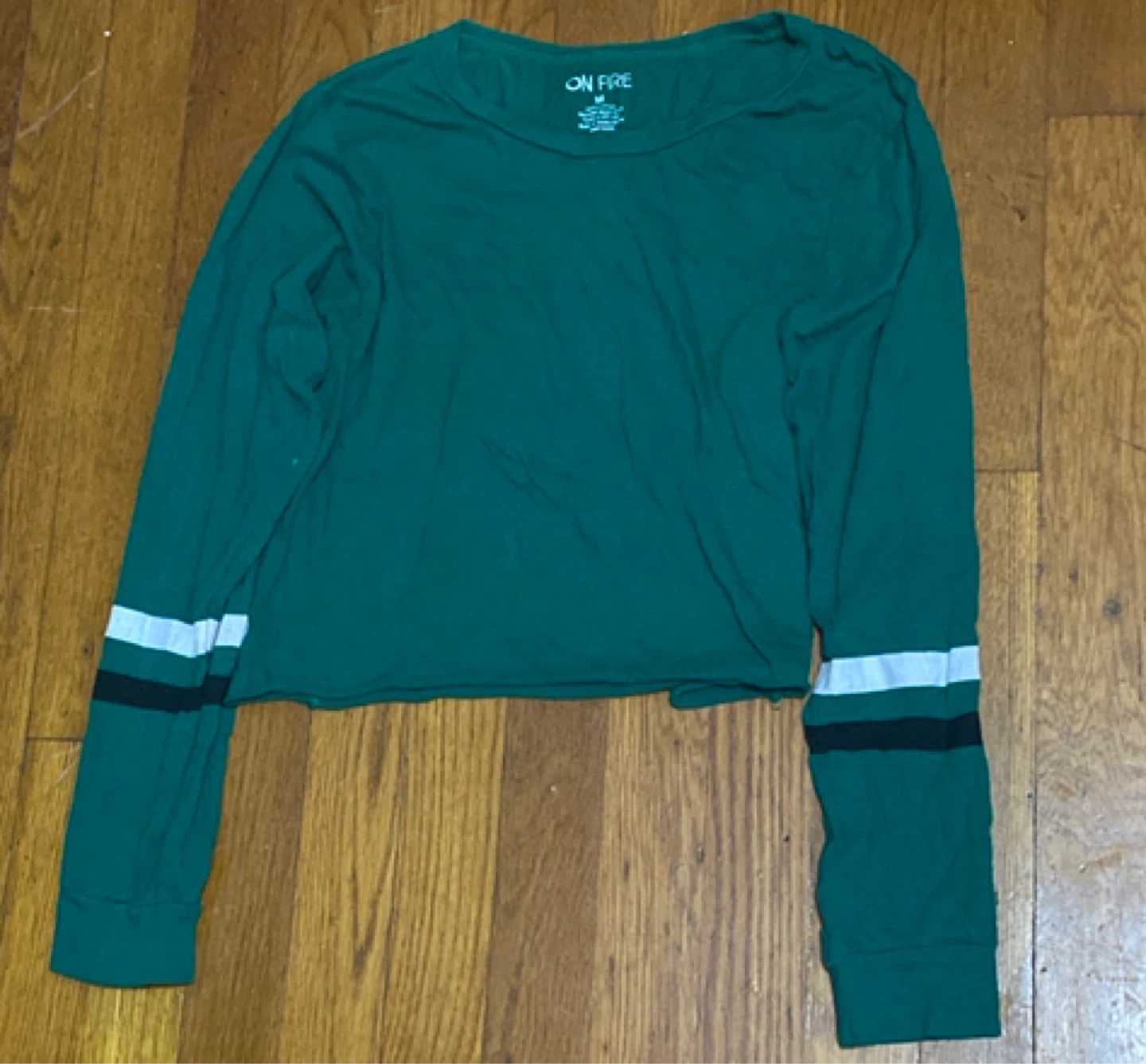 I'm selling an On Fire long sleeve shirt! It's a size medium and features a stylish green color with stripes on the sleeves