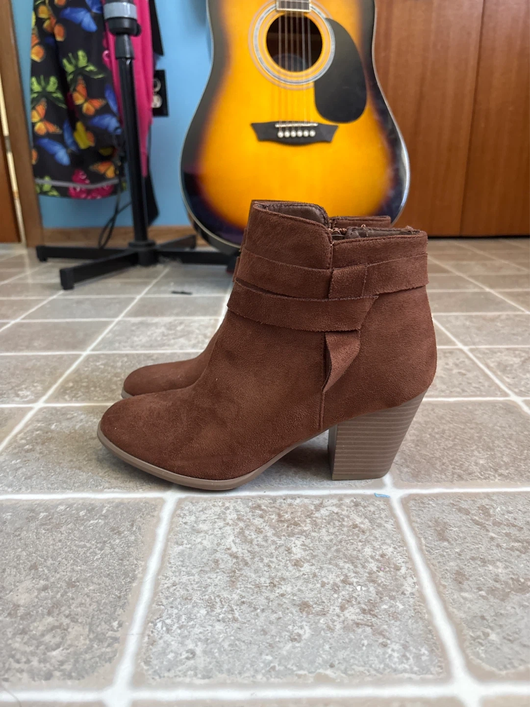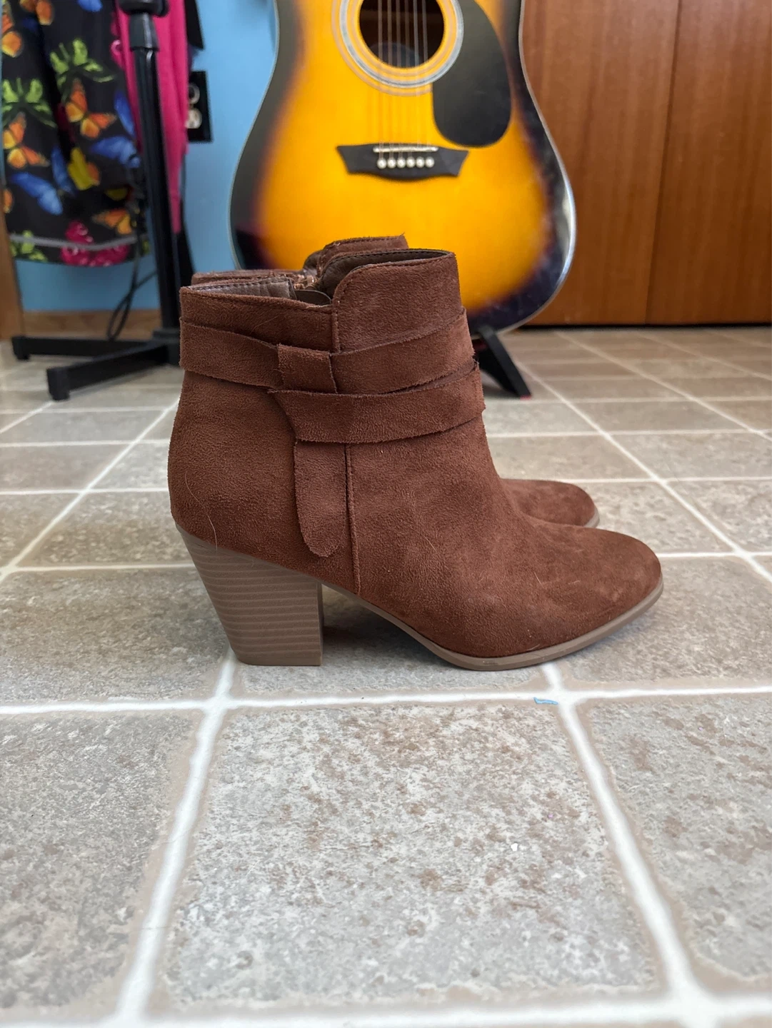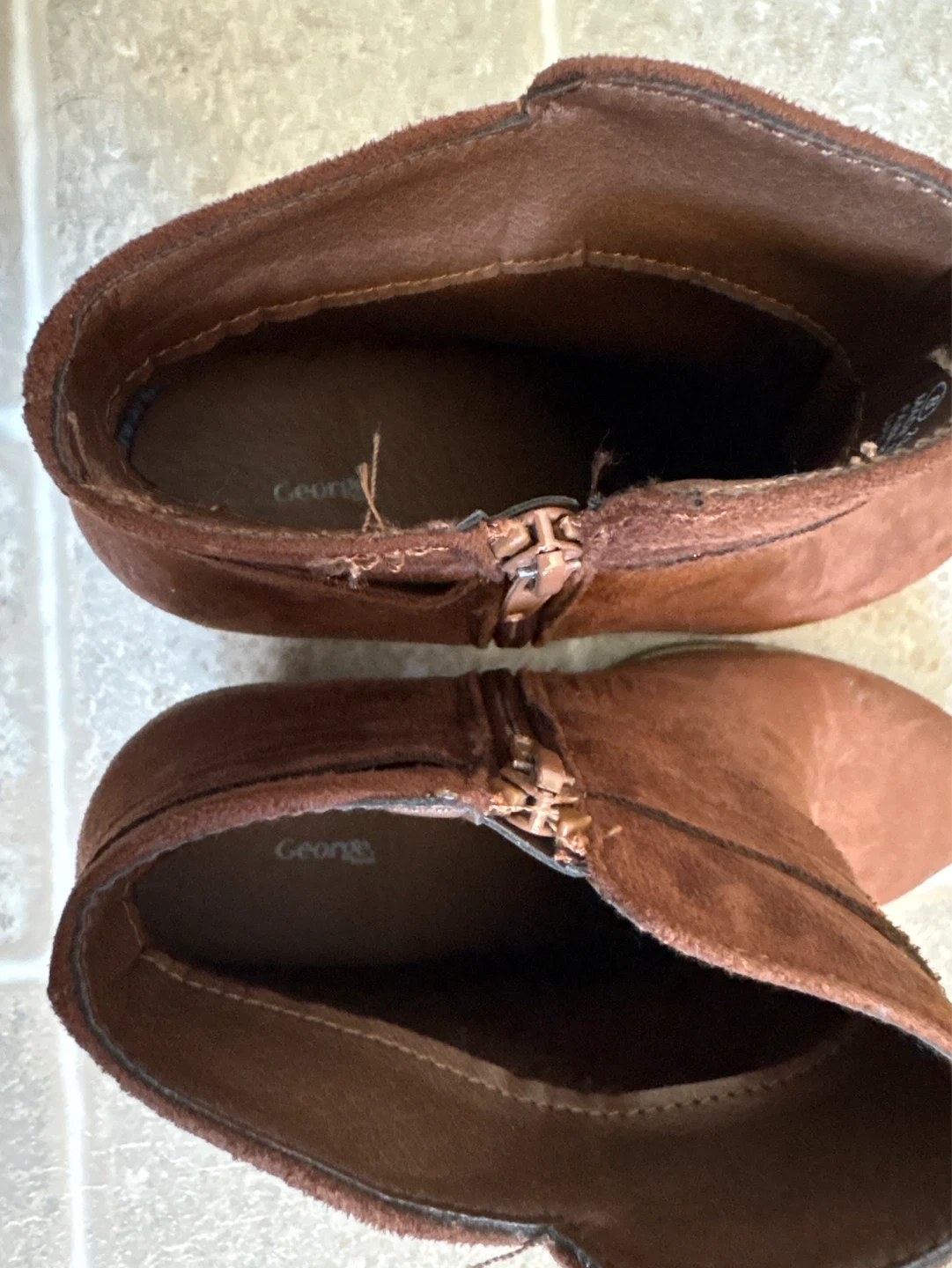 These brown suede ankle boots have a side zipper closure and decorative straps. They feature a block heel and a round toe. The brand is George.