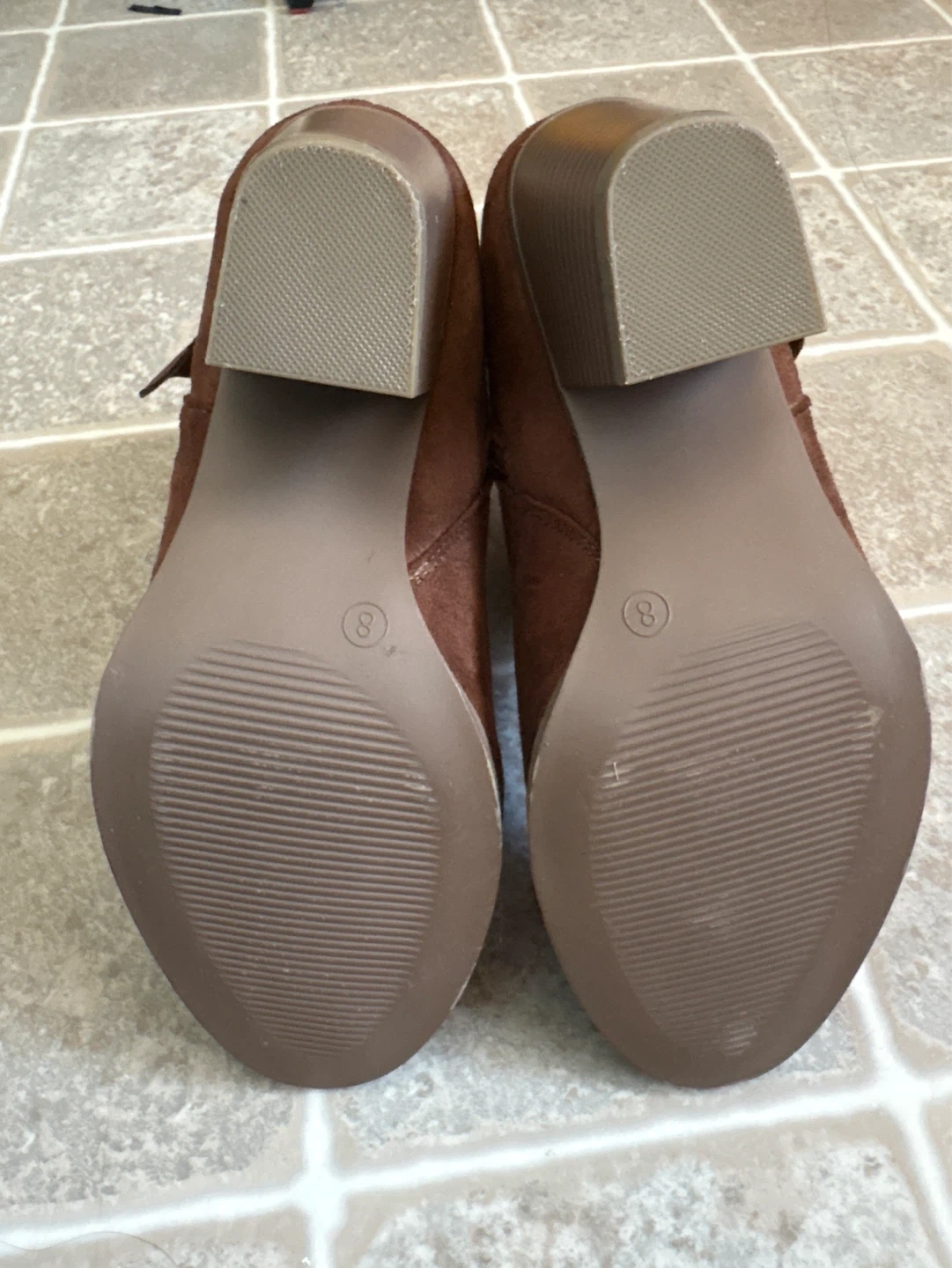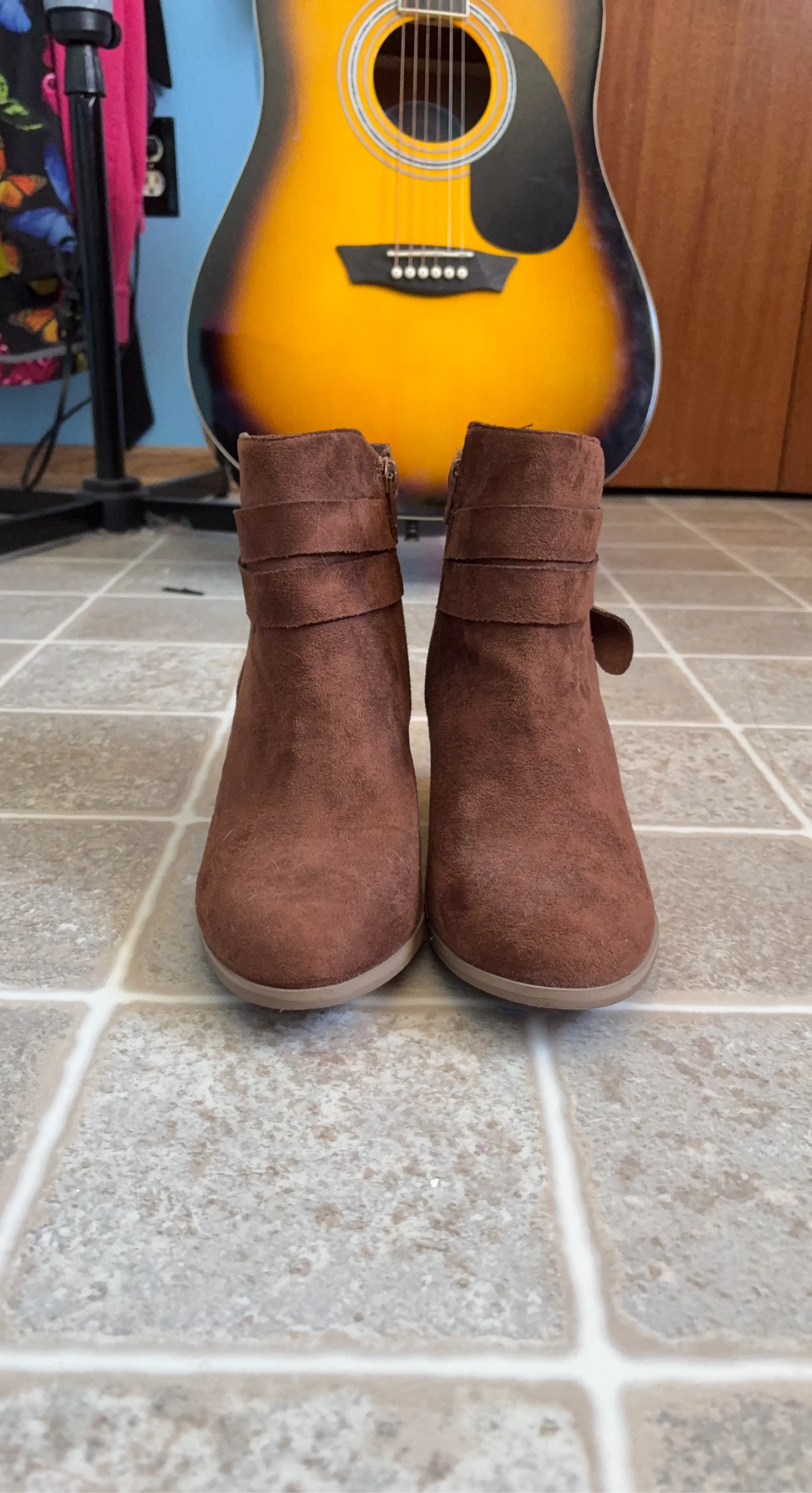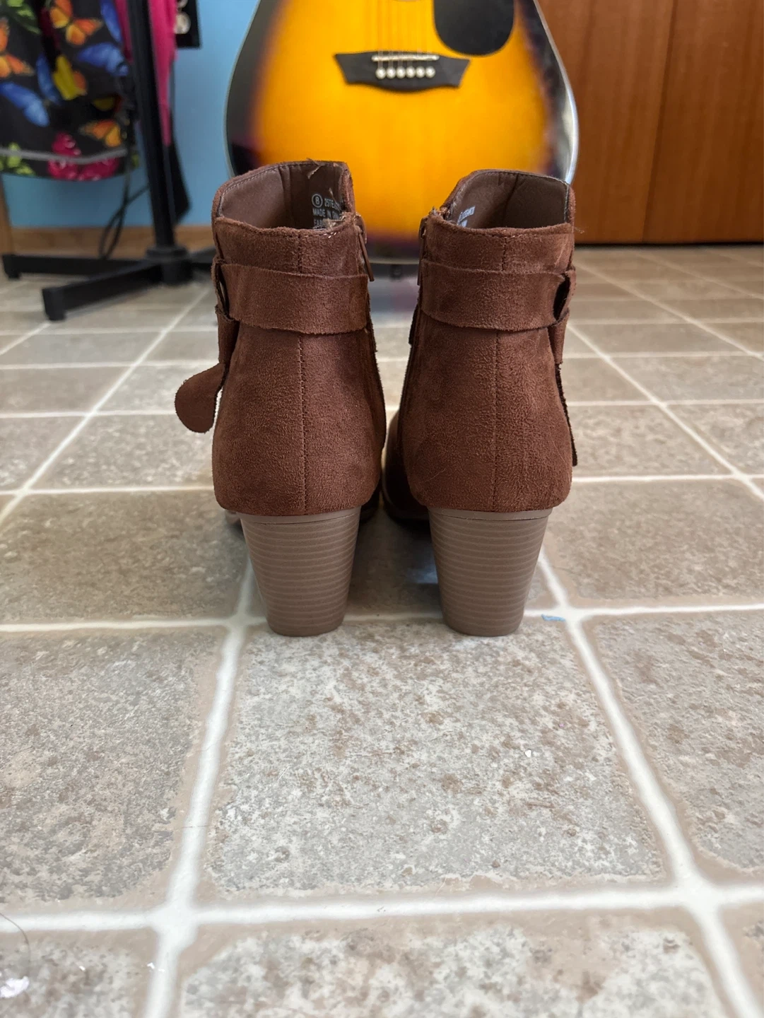 These brown suede ankle boots have a side zipper closure and decorative straps. They feature a block heel and a round toe. The brand is George.