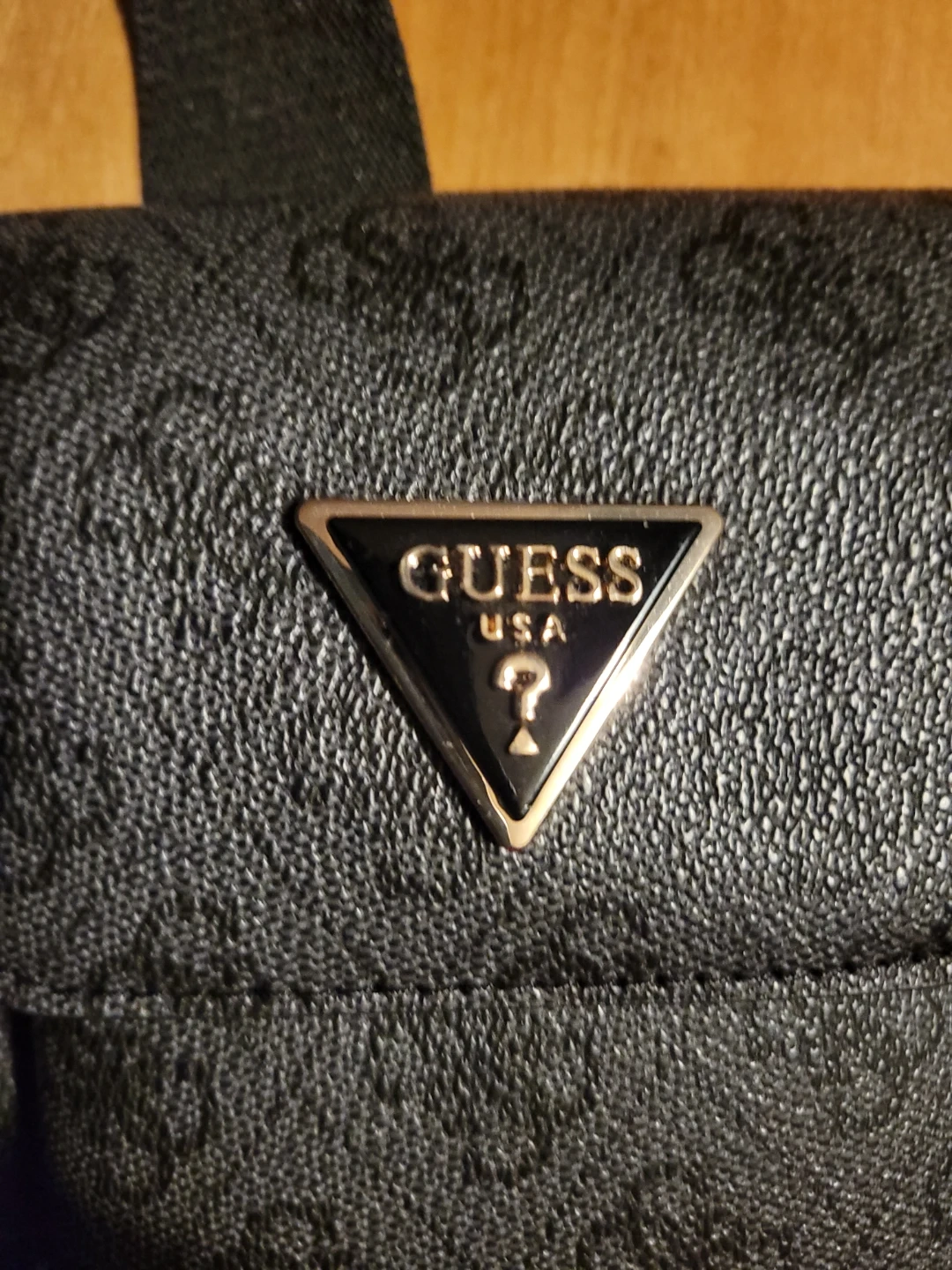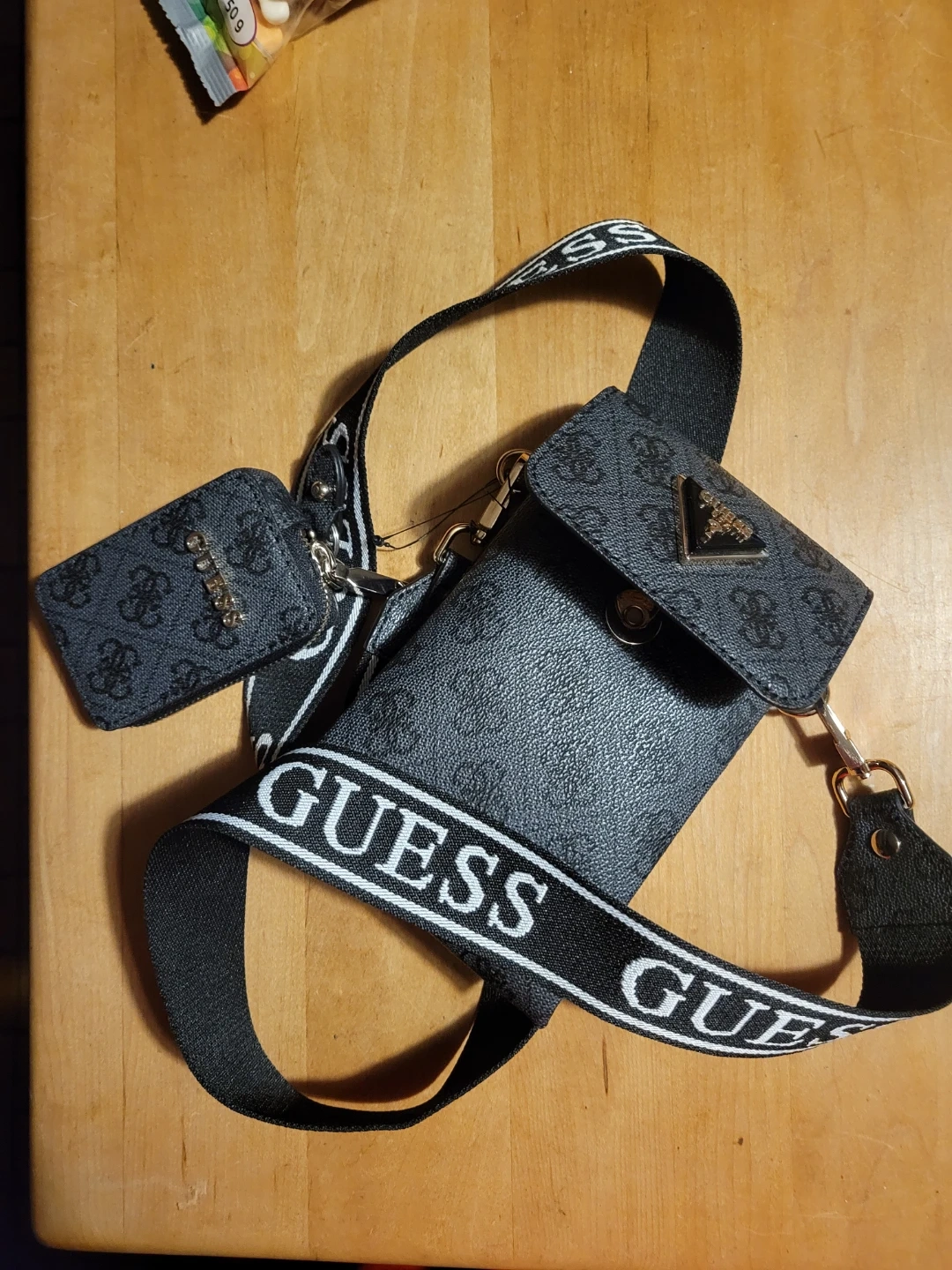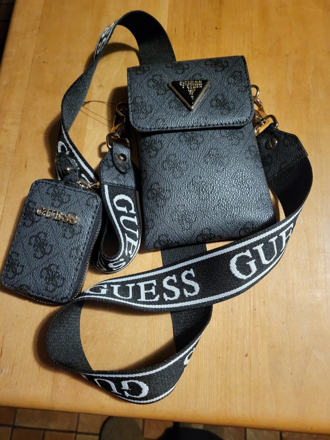 This is a black Guess crossbody bag with an all-over logo print. It's a handy size for your phone and essentials, and it comes with a matching coin purse. The strap has the Guess logo printed on it.