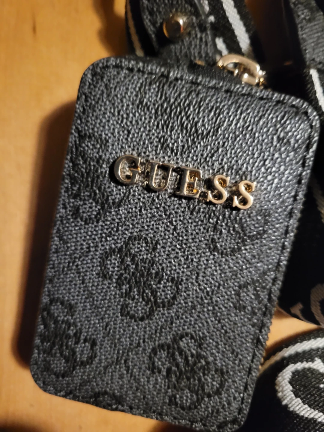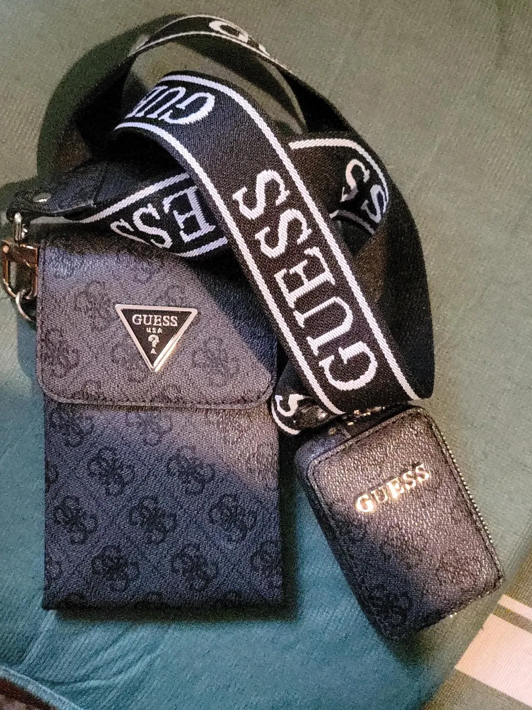 This is a black Guess crossbody bag with an all-over logo print. It's a handy size for your phone and essentials, and it comes with a matching coin purse. The strap has the Guess logo printed on it.