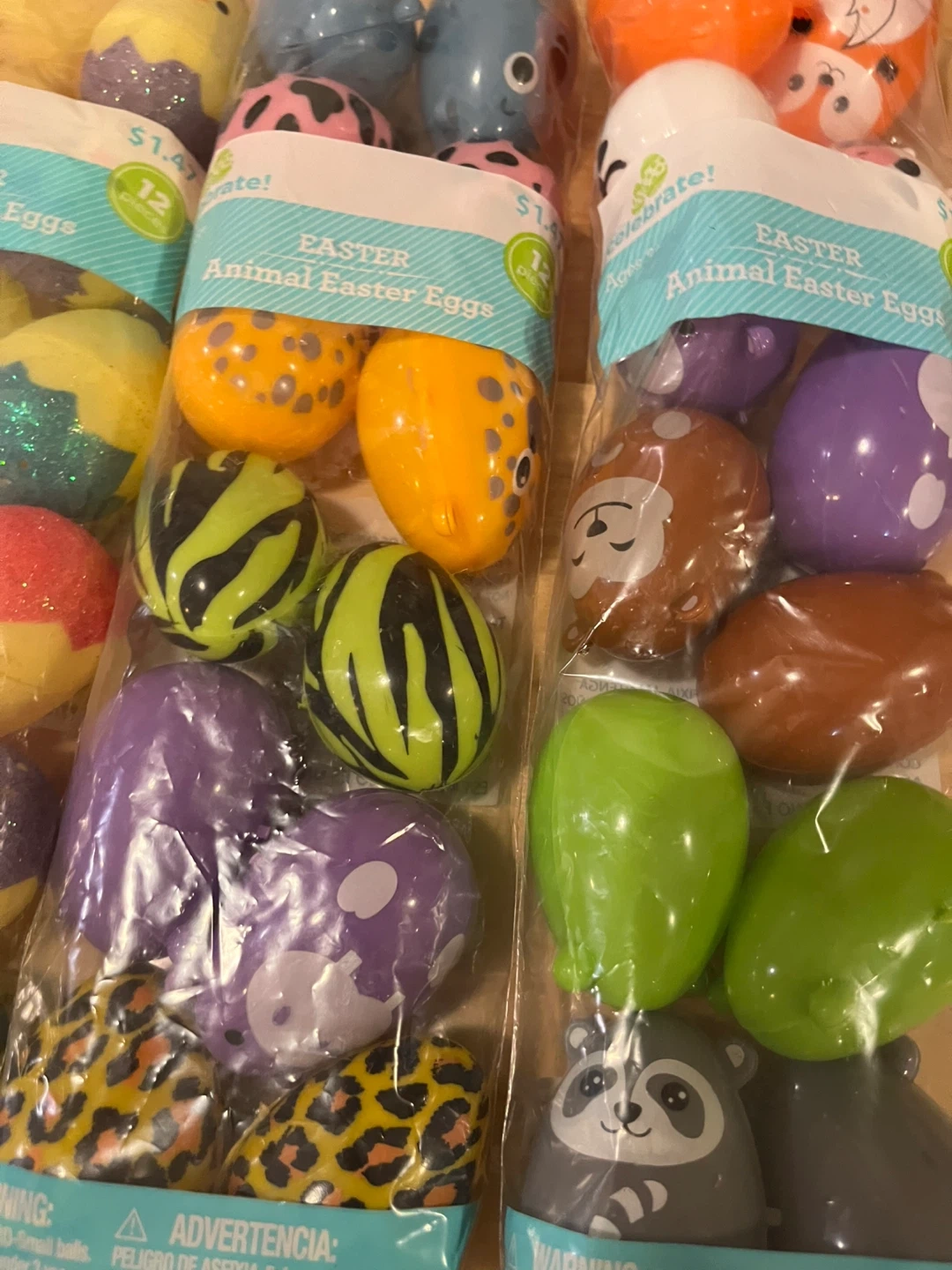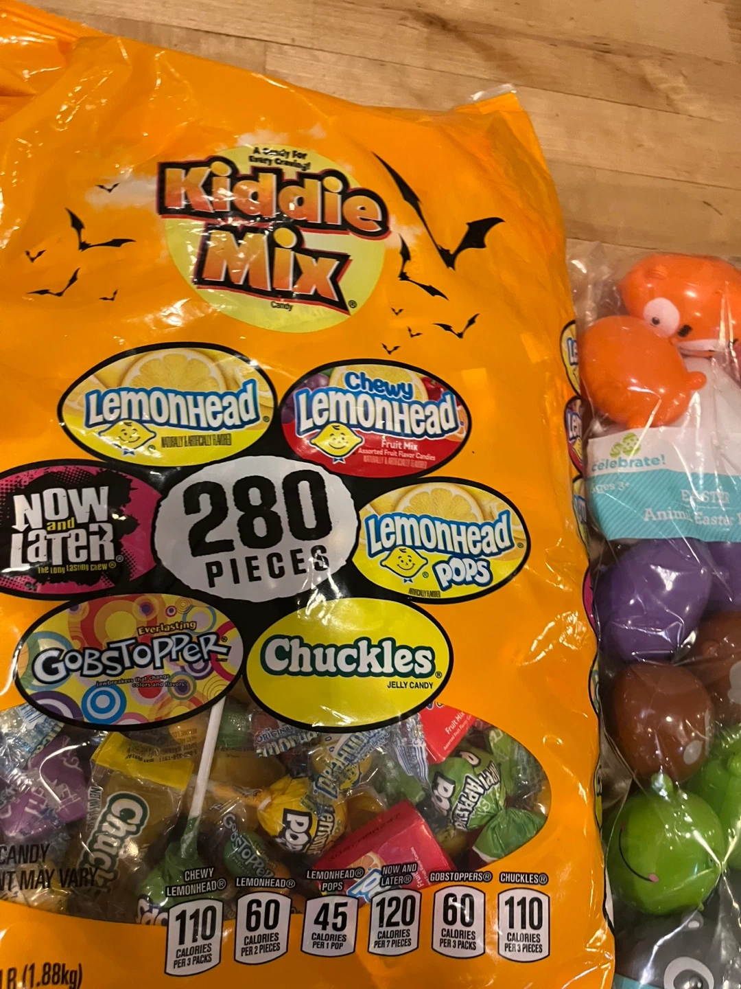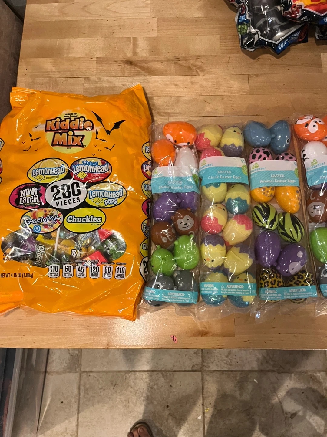 This bundle includes bags of Celebrate! Animal Easter Eggs and Chick Easter Eggs, along with a large bag of Kiddie Mix candy. The Easter eggs contain small plastic toys. The Kiddie Mix candy bag has 280 pieces featuring Lemonhead, Now and Later, Gobstopper, and Chuckles candies.plus 48 Easter Eggs