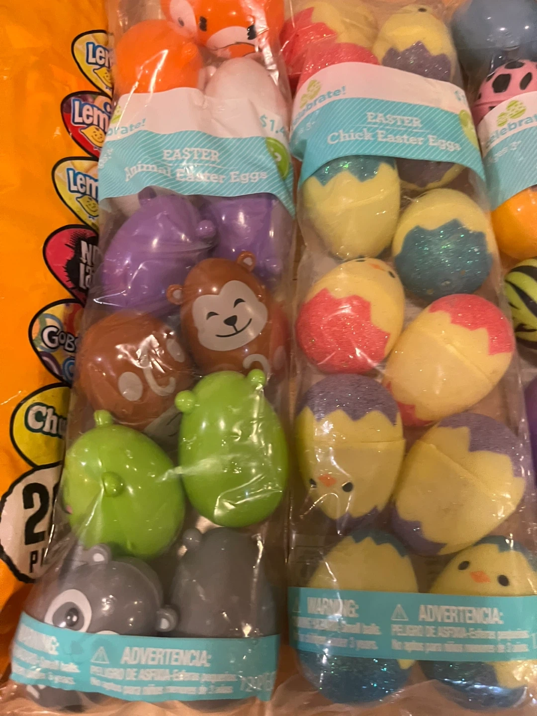This bundle includes bags of Celebrate! Animal Easter Eggs and Chick Easter Eggs, along with a large bag of Kiddie Mix candy. The Easter eggs contain small plastic toys. The Kiddie Mix candy bag has 280 pieces featuring Lemonhead, Now and Later, Gobstopper, and Chuckles candies.plus 48 Easter Eggs