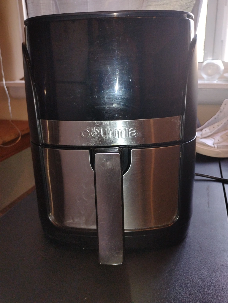 Black air fryer with digital interface. Features several cooking presets. Stainless steel accents. Start your day off peacefully with a healthy breakfast, made with the help of this air fryer.