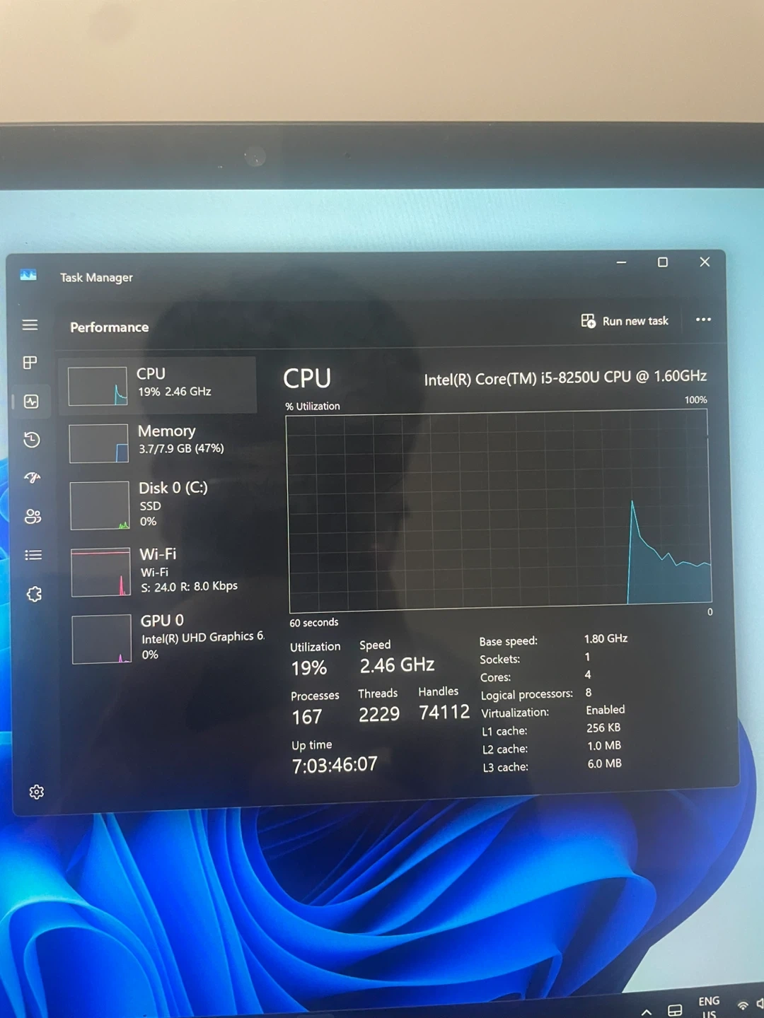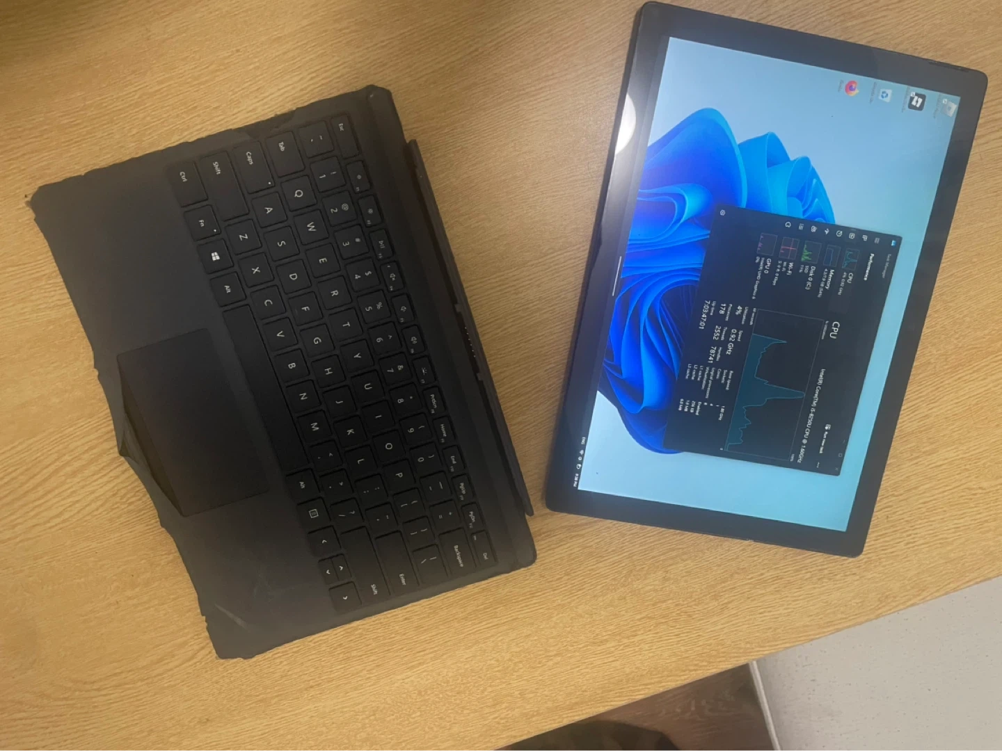 Microsoft Surface Pro 6 with detachable keyboard(BAD CONDITION BUT WORKS FINE). Features an Intel Core i5-8250U CPU at 1.60GHz. Includes 8GB RAM and a 256GB