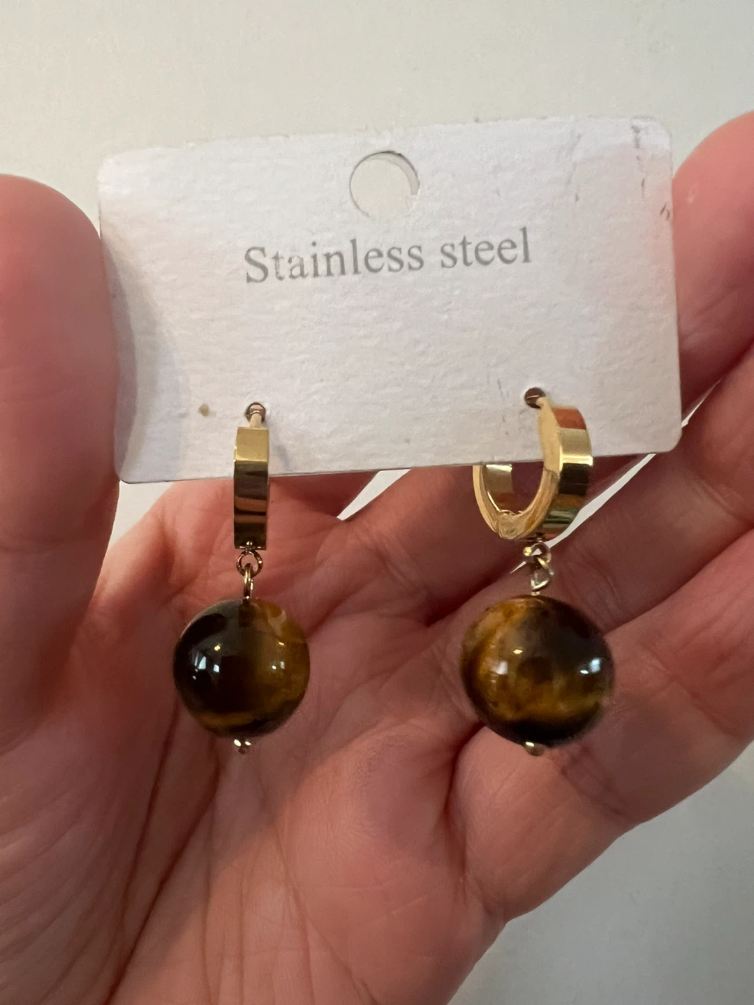 These stylish hoop earrings are crafted from gold-tone stainless steel and feature natural tiger's eye stone beads. They're lightweight and offer a touch of earthy elegance. A great accessory to complement many outfits!