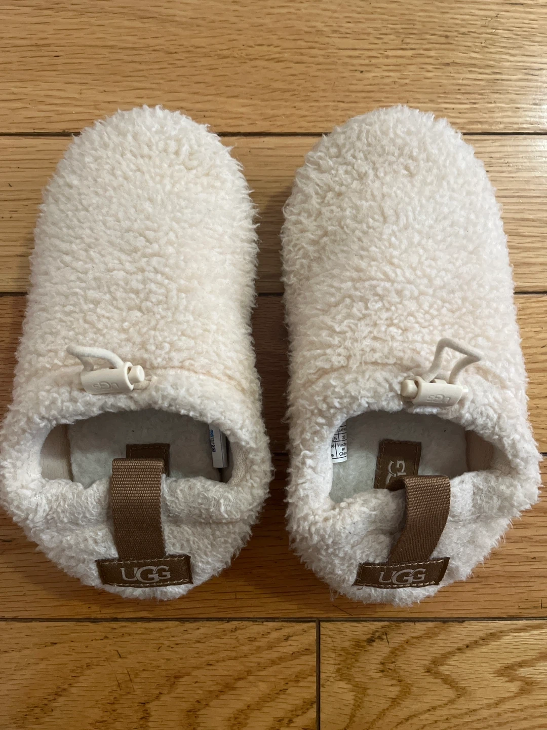 Cozy UGG slippers in a cream fleece material. Features a toggle drawstring for a secure fit. Great for indoor comfort!