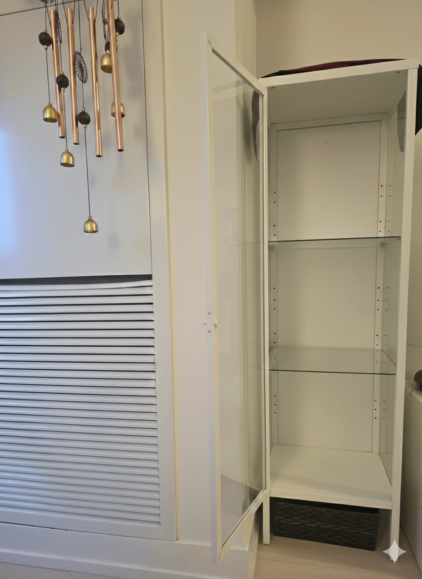 This IKEA FABRIKÖR cabinet is white with glass doors and shelves. It's great for displaying items or for storage. The dimensions are 17.75" x 15.375" x 56.625".