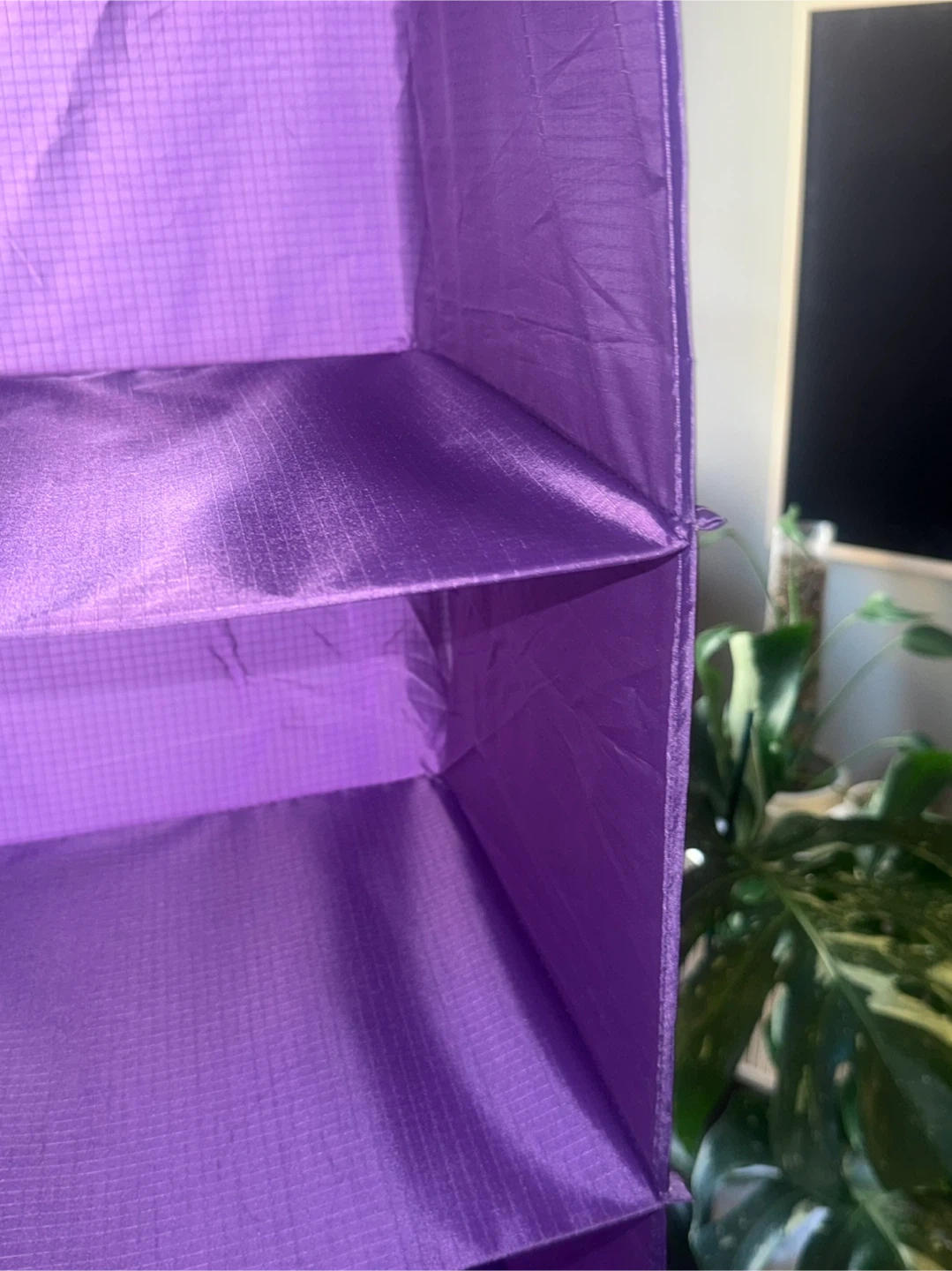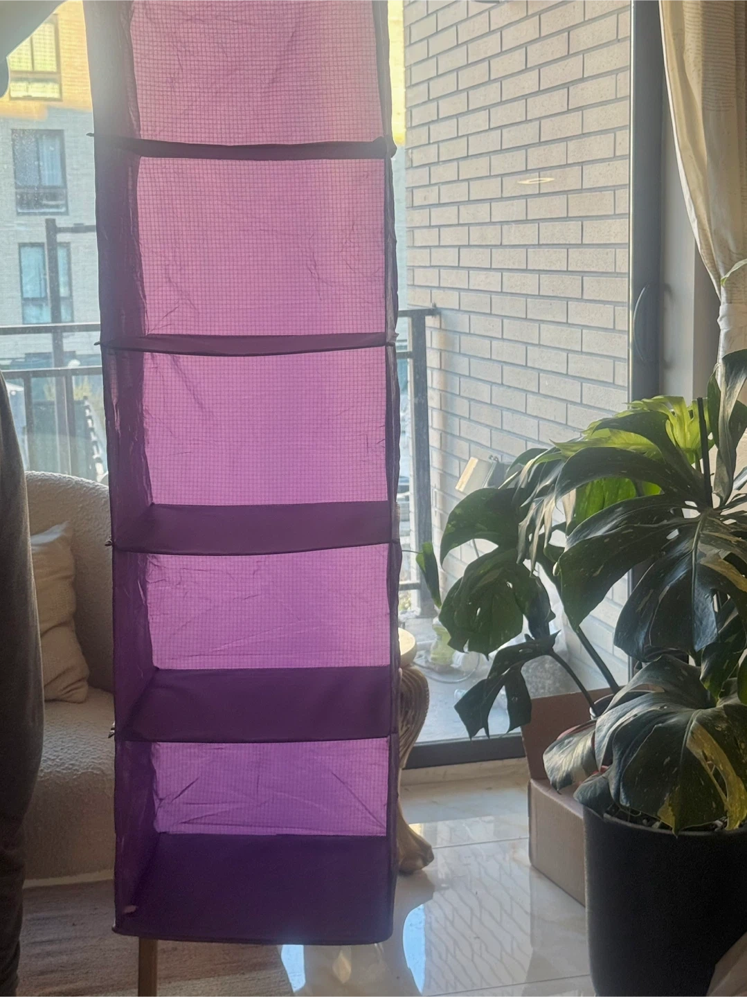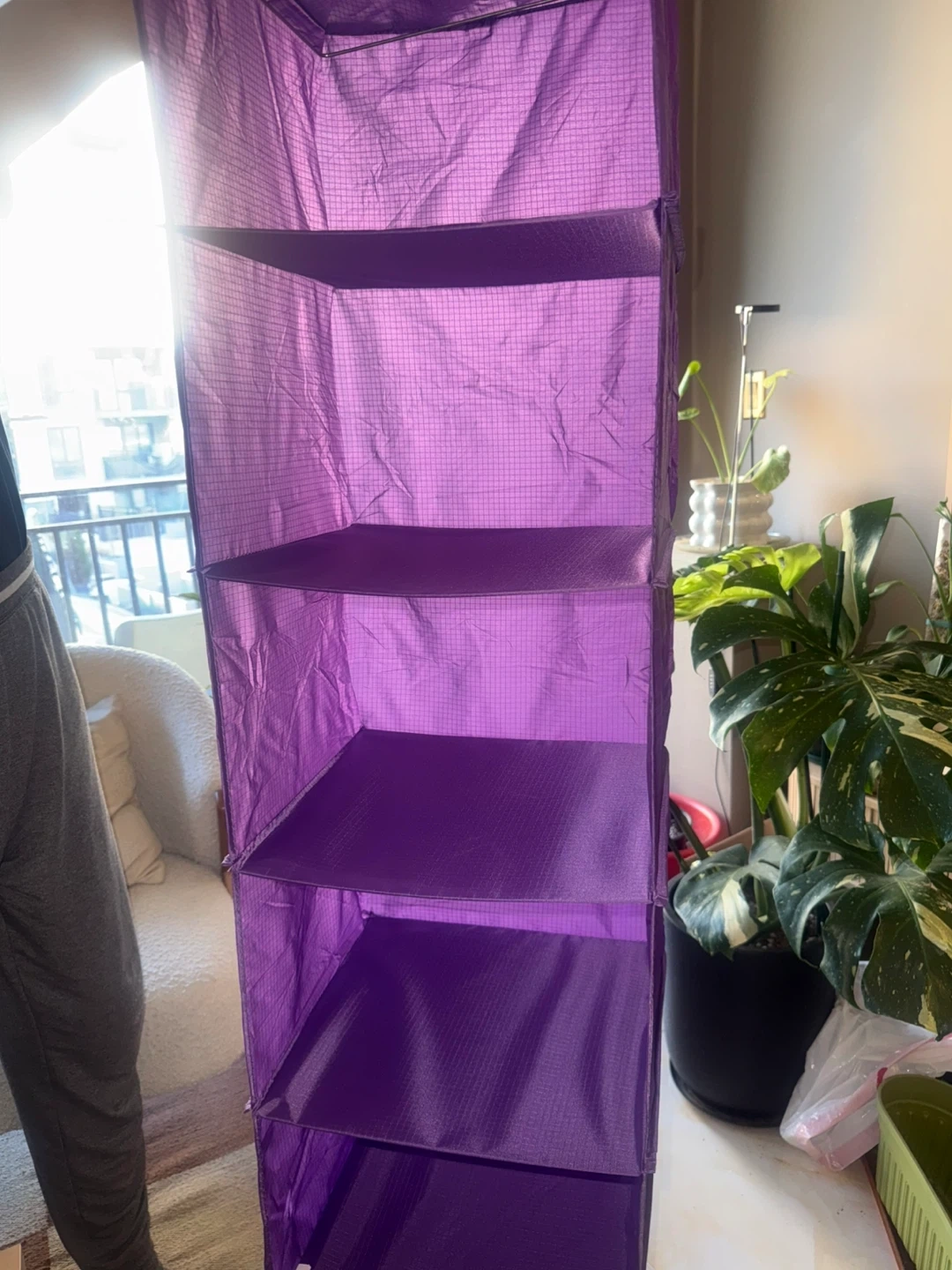 This is a purple hanging closet organizer. It features five shelves for storage. Pick up from queens elmhurst.